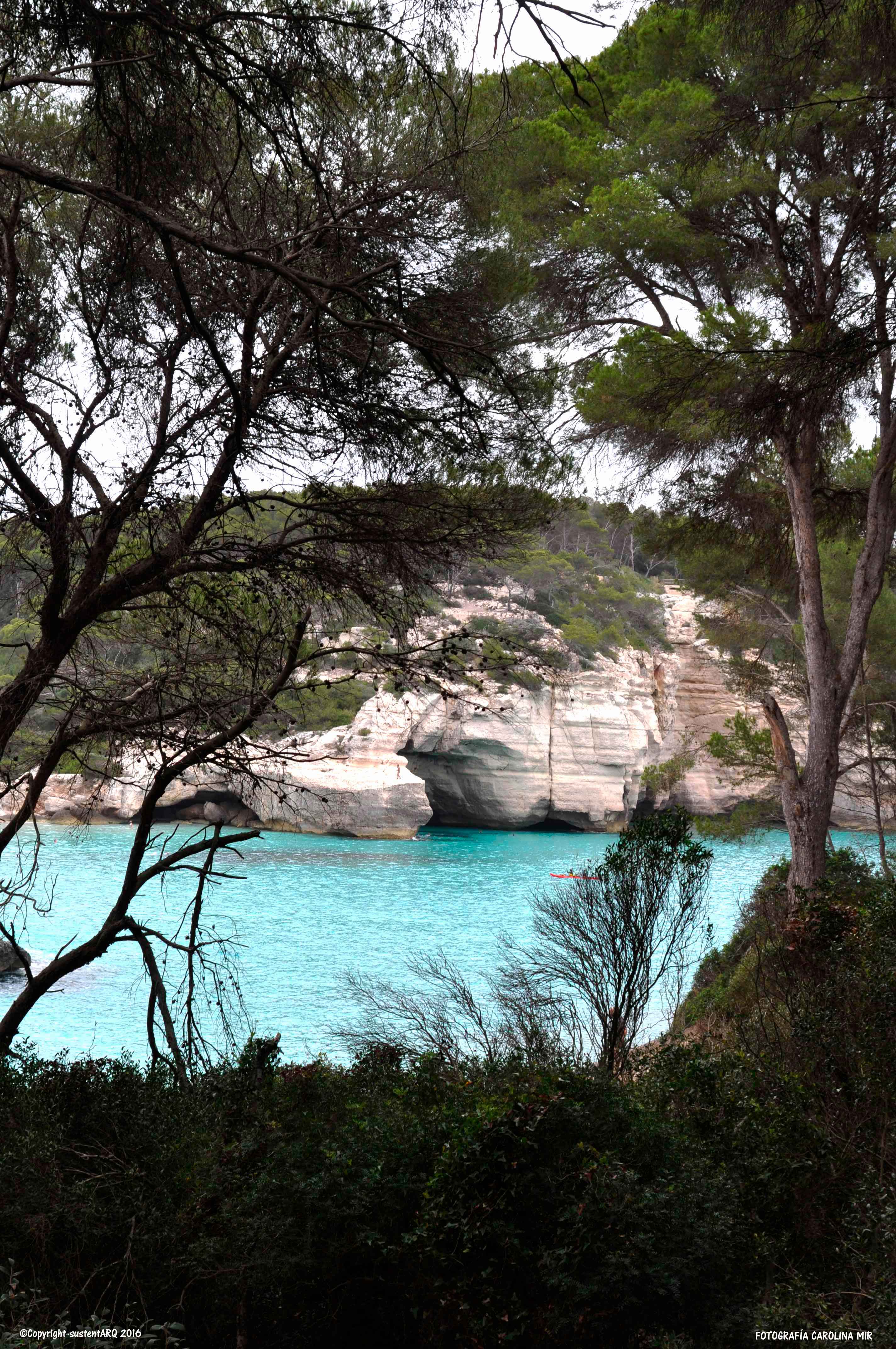 Adentrarte en un bosque mediterráneo de carrascas, pinos y enebros, y que de repente la misma vegetación te abra las vistas sobre la arena blanca y el agua turquesa de la CALA MITJANA, es un REGALO PARA TODOS LOS SENTIDOS.