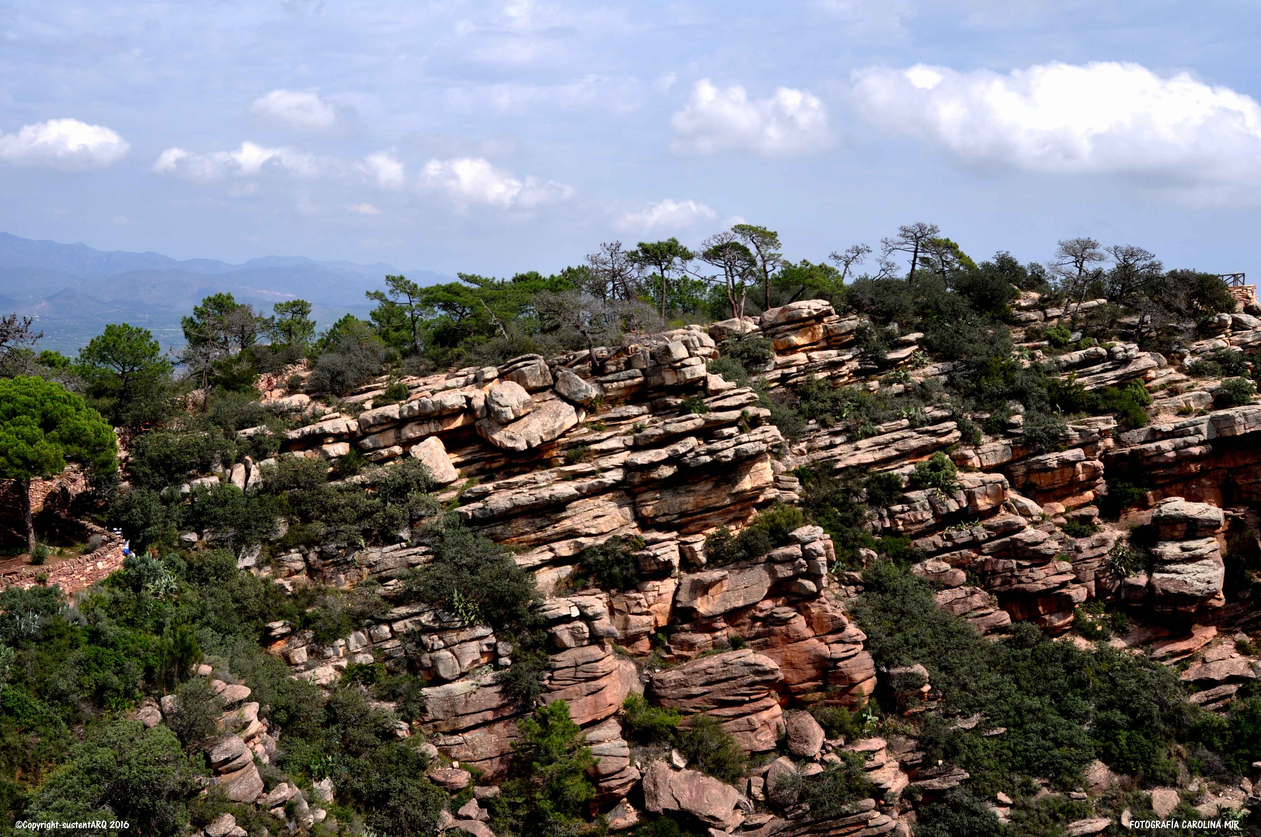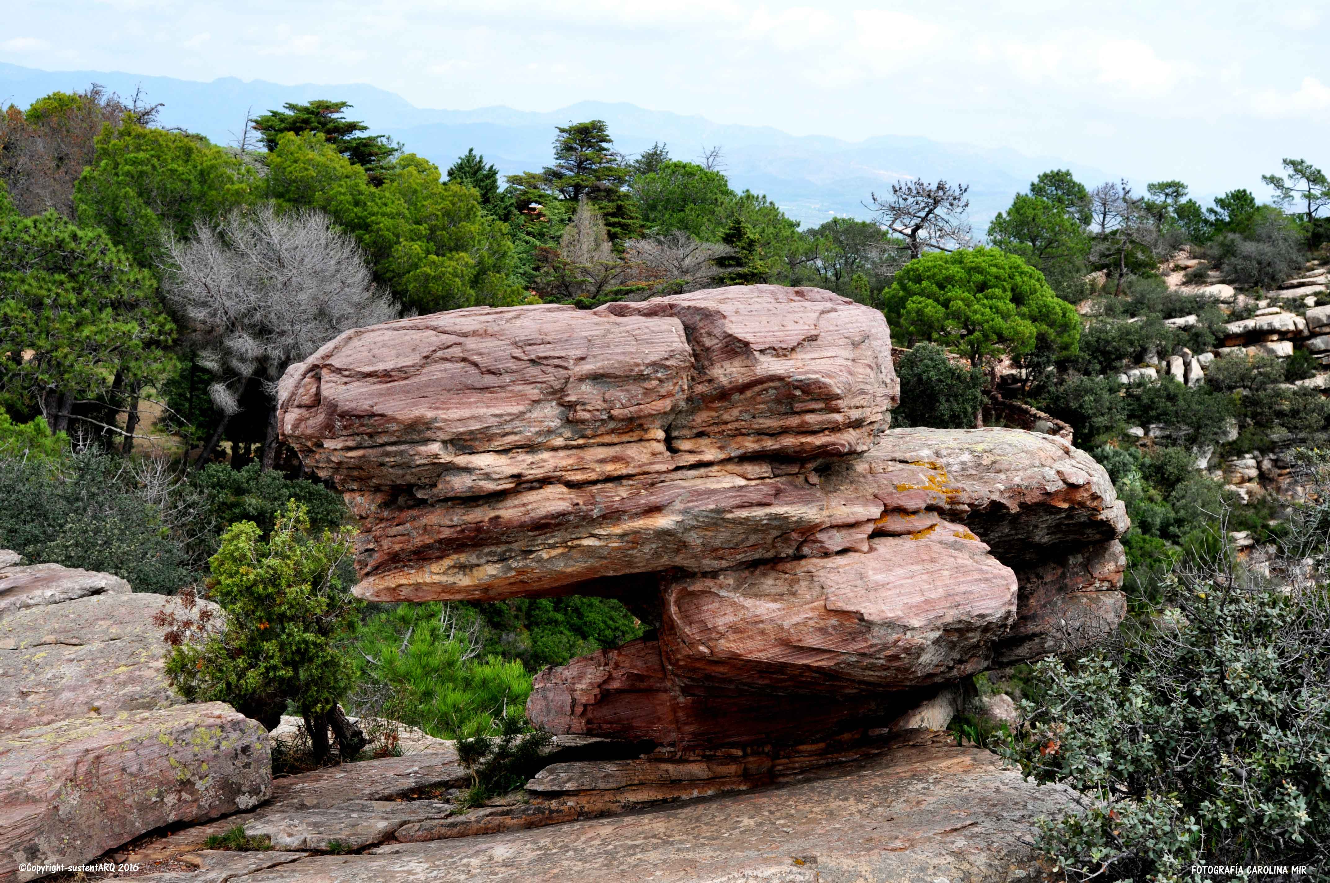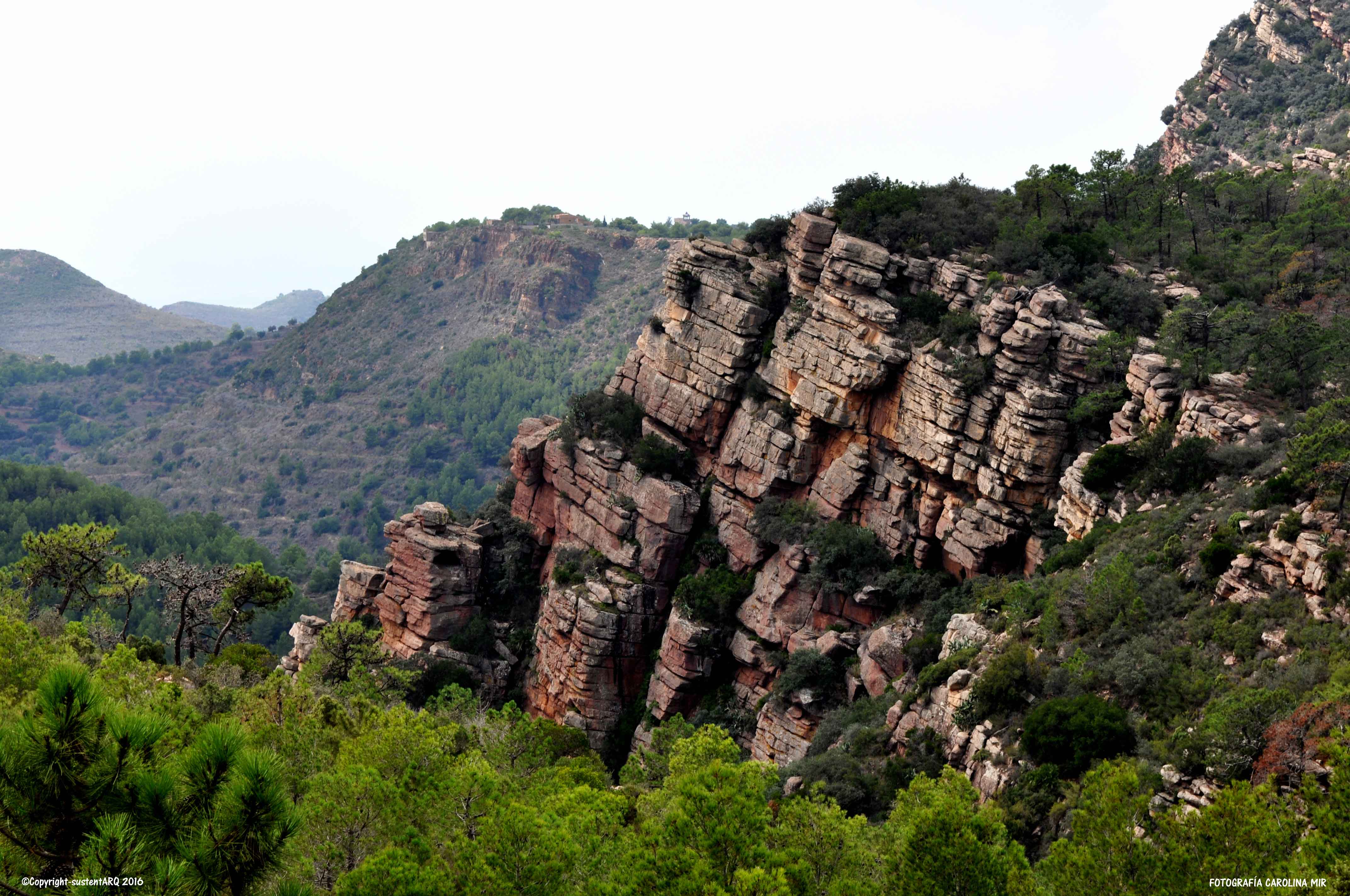 Colinas de hamburguesas de areniscas rojas, rodeadas de pino carrasco y matorral de brezo, aliaga, jaguarza y romero.