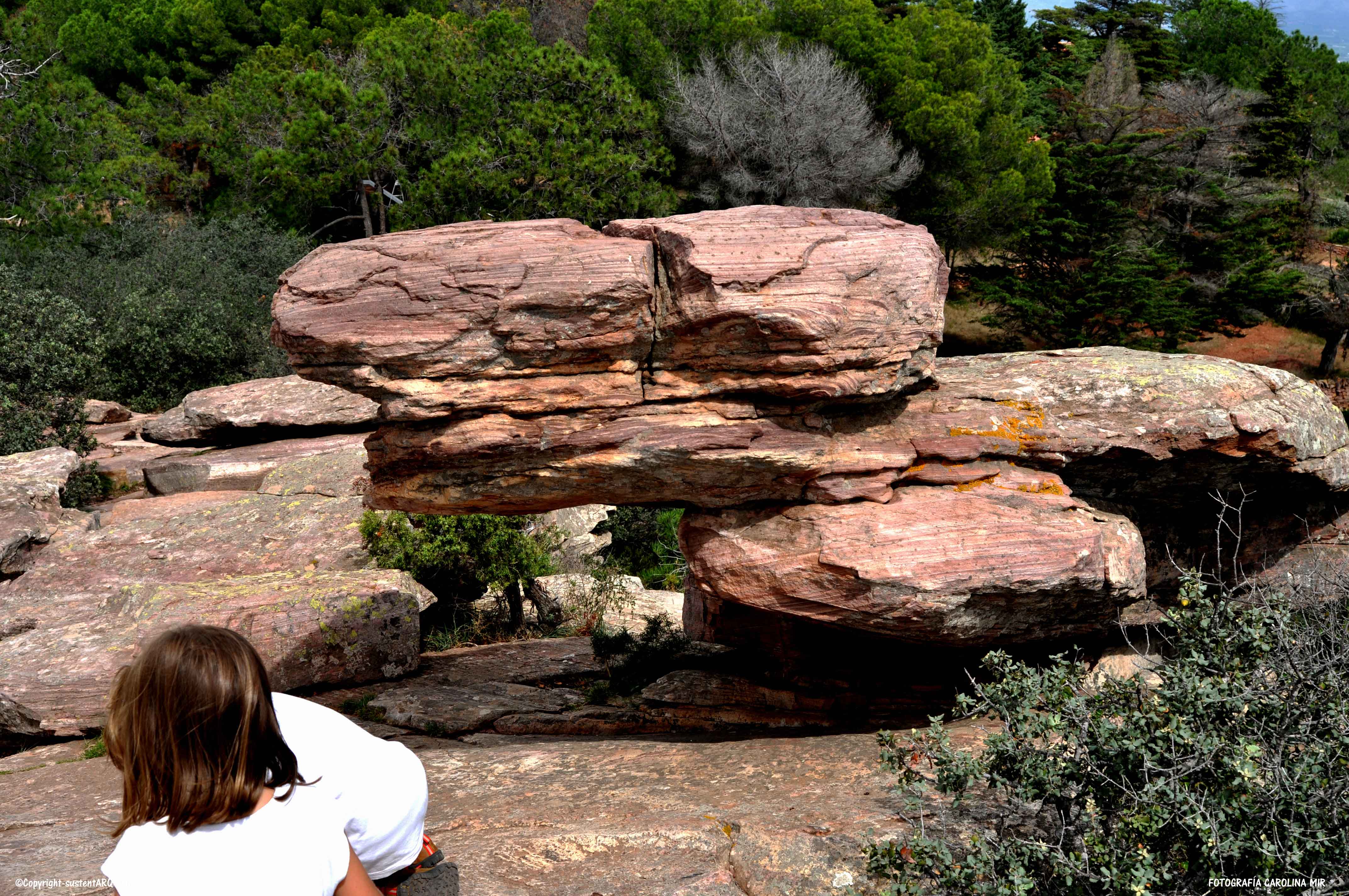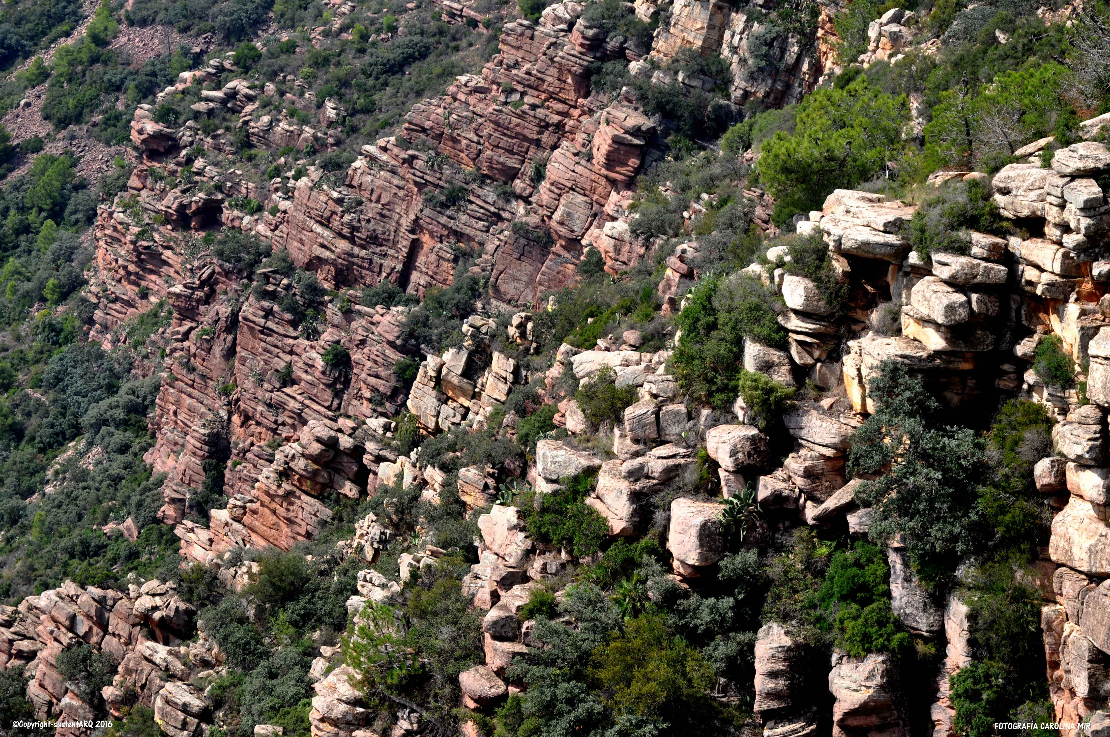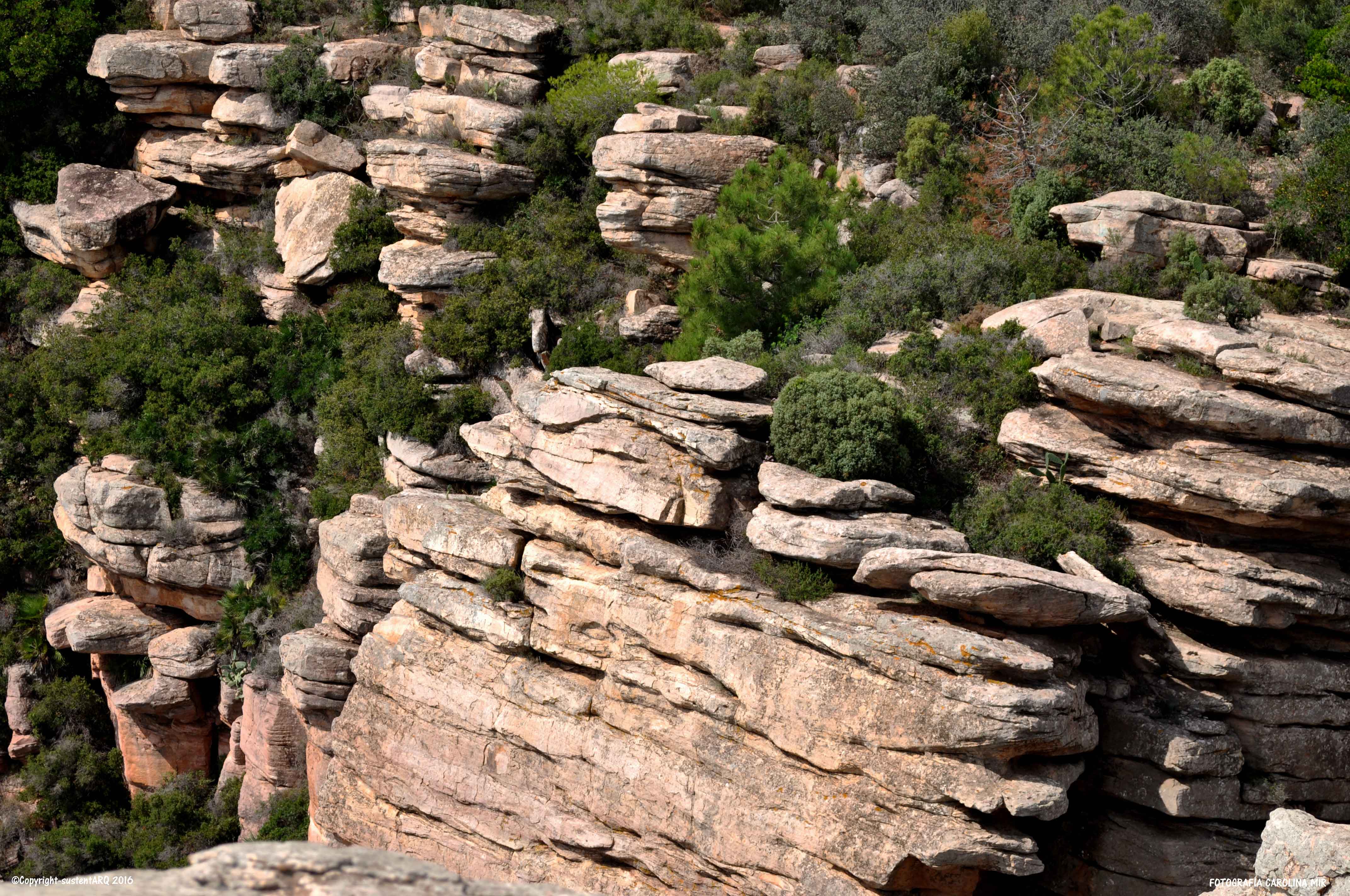 Colinas de hamburguesas de areniscas rojas, rodeadas de pino carrasco y matorral de brezo, aliaga, jaguarza y romero.