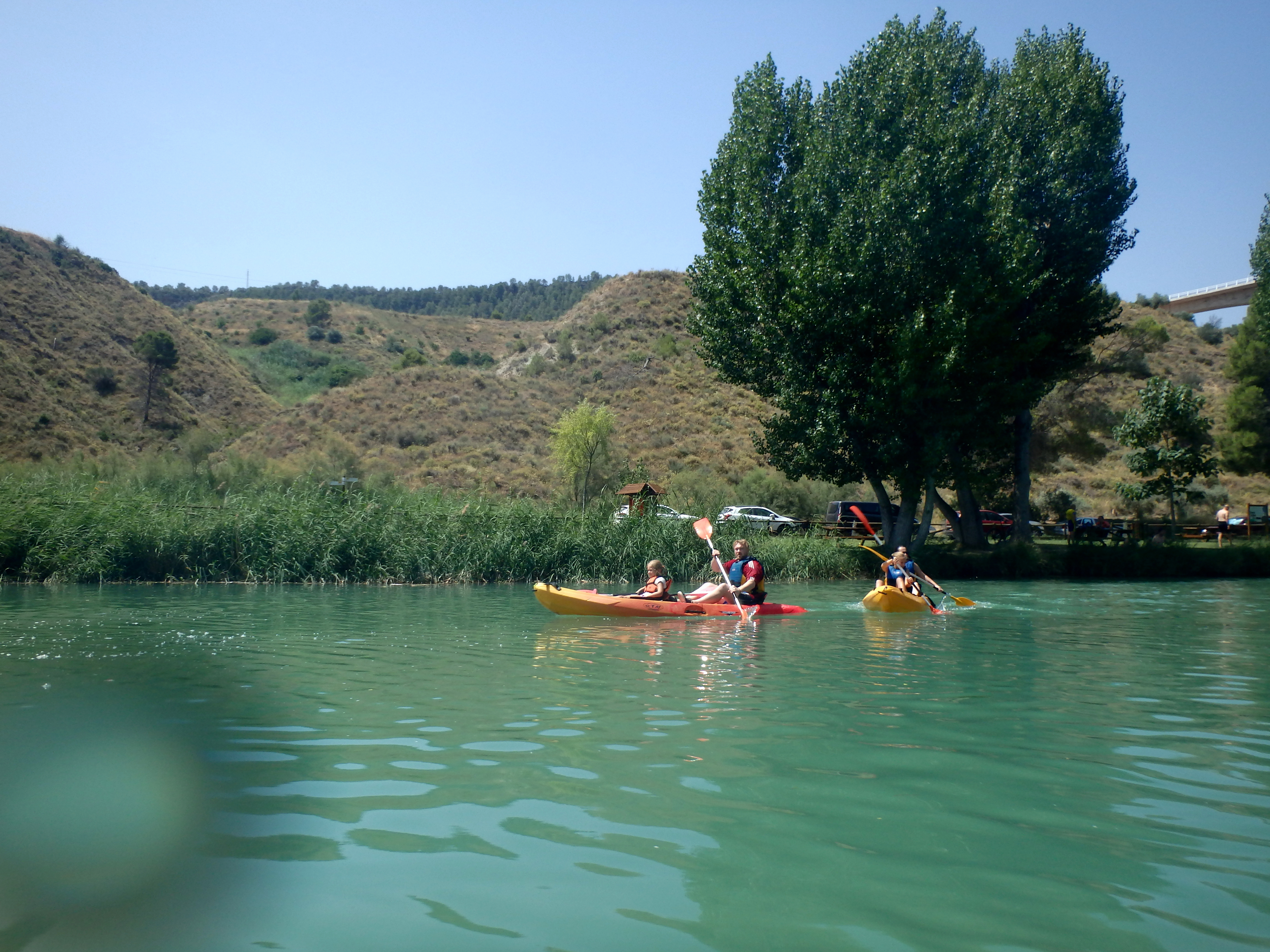 Más o menos a mitad camino, debajo del puente que cruza el río para llegar a Cofrentes, hay un área recreativa con un embarcadero donde hemos hecho una parada para descansar, beber agua y darnos un bañito.