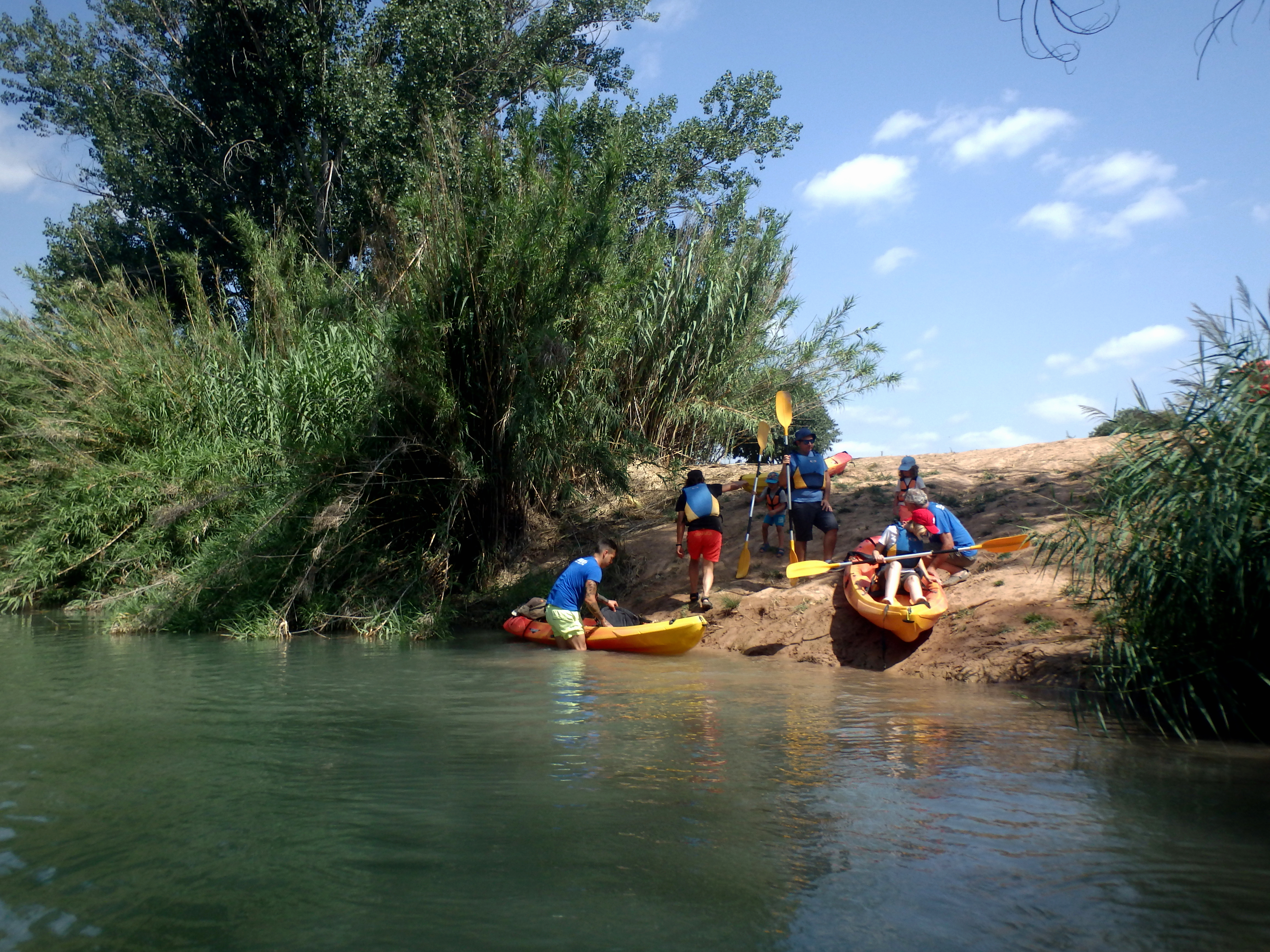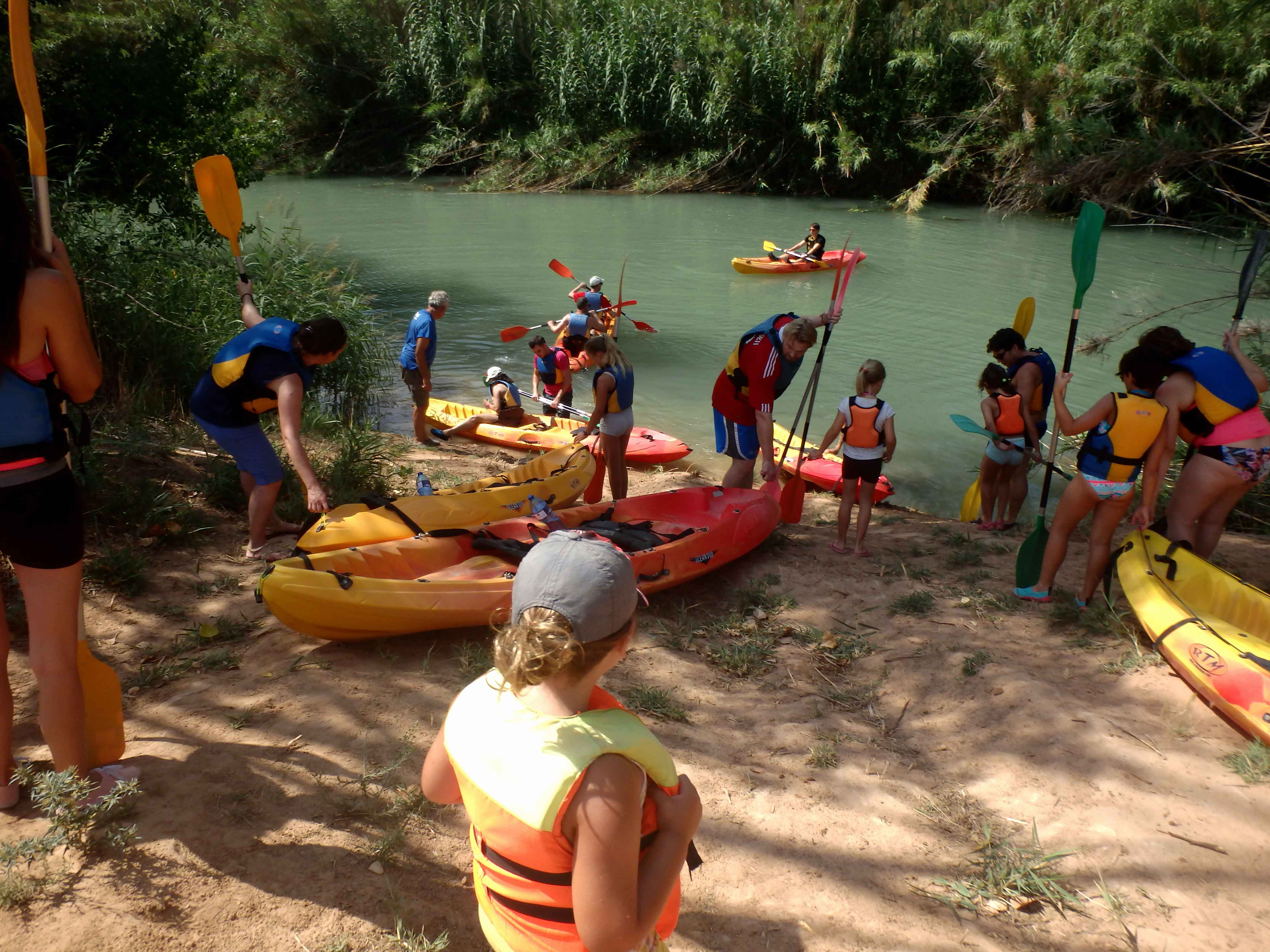 A las 11h de la mañana ya estamos preparados en el Salto de Cofrentes para meternos por el agua. Hemos alquilado cinco piragüas de dos personas, para un adulto con un nano o para dos adultos con un nano pequeño.