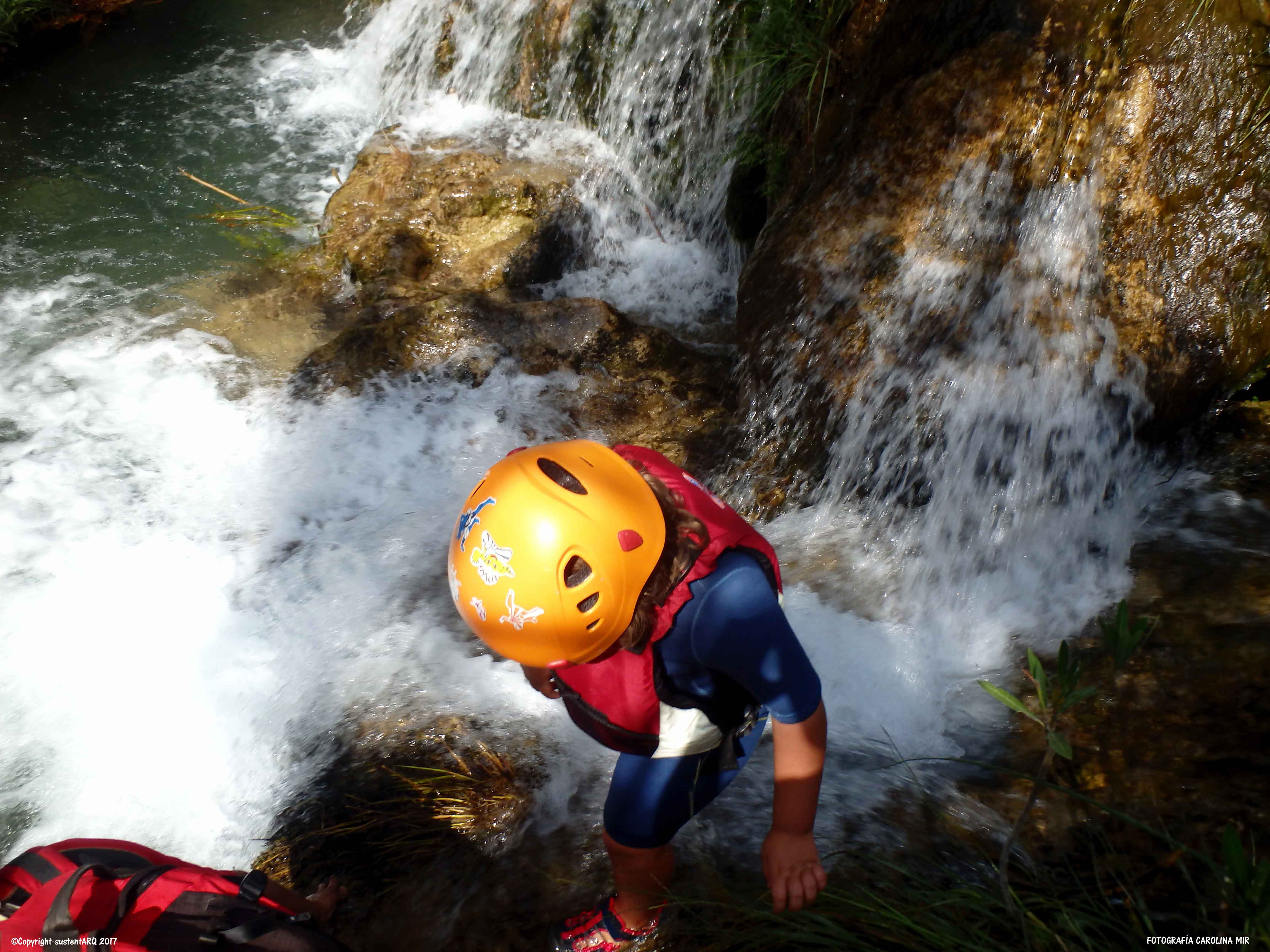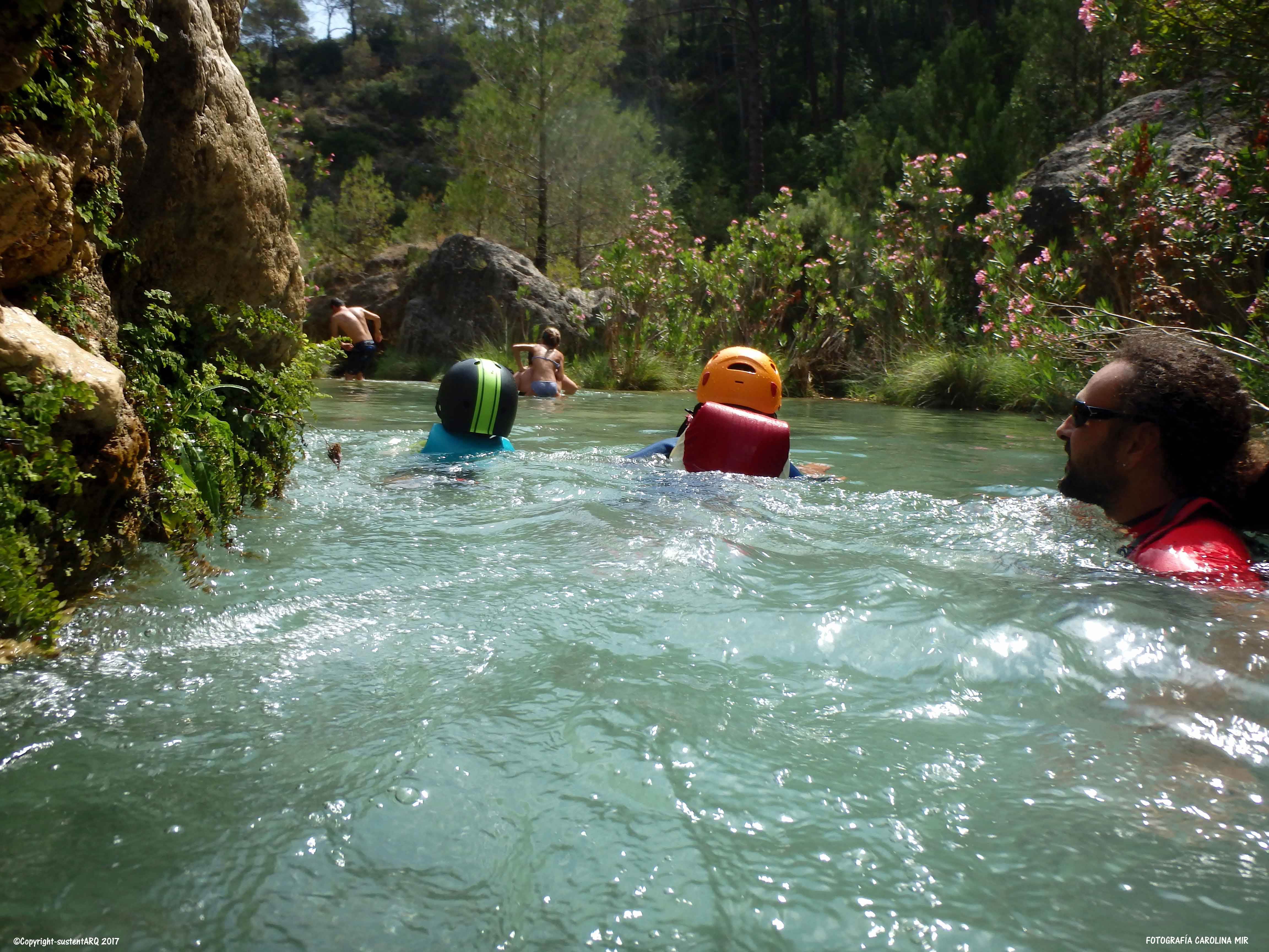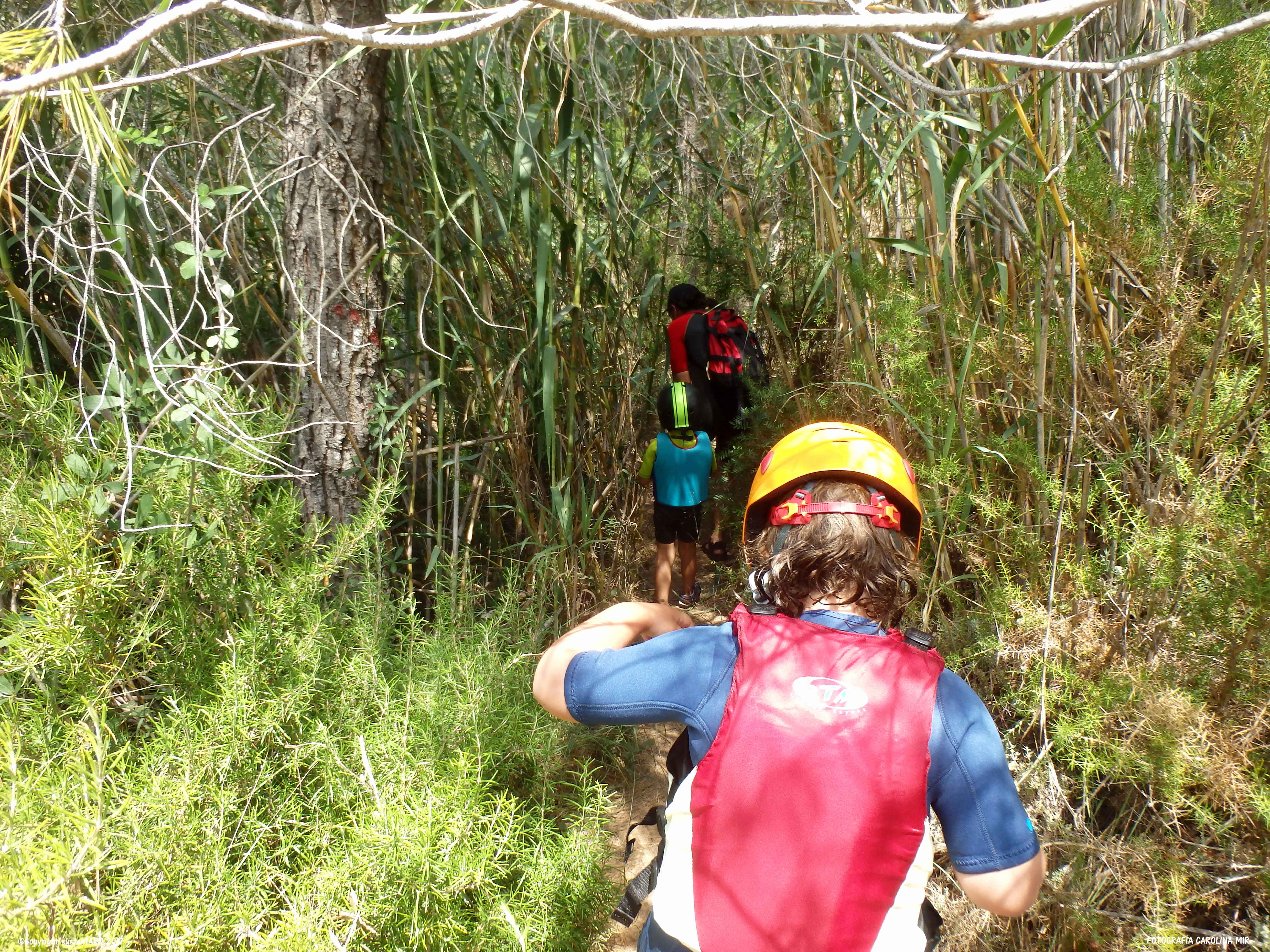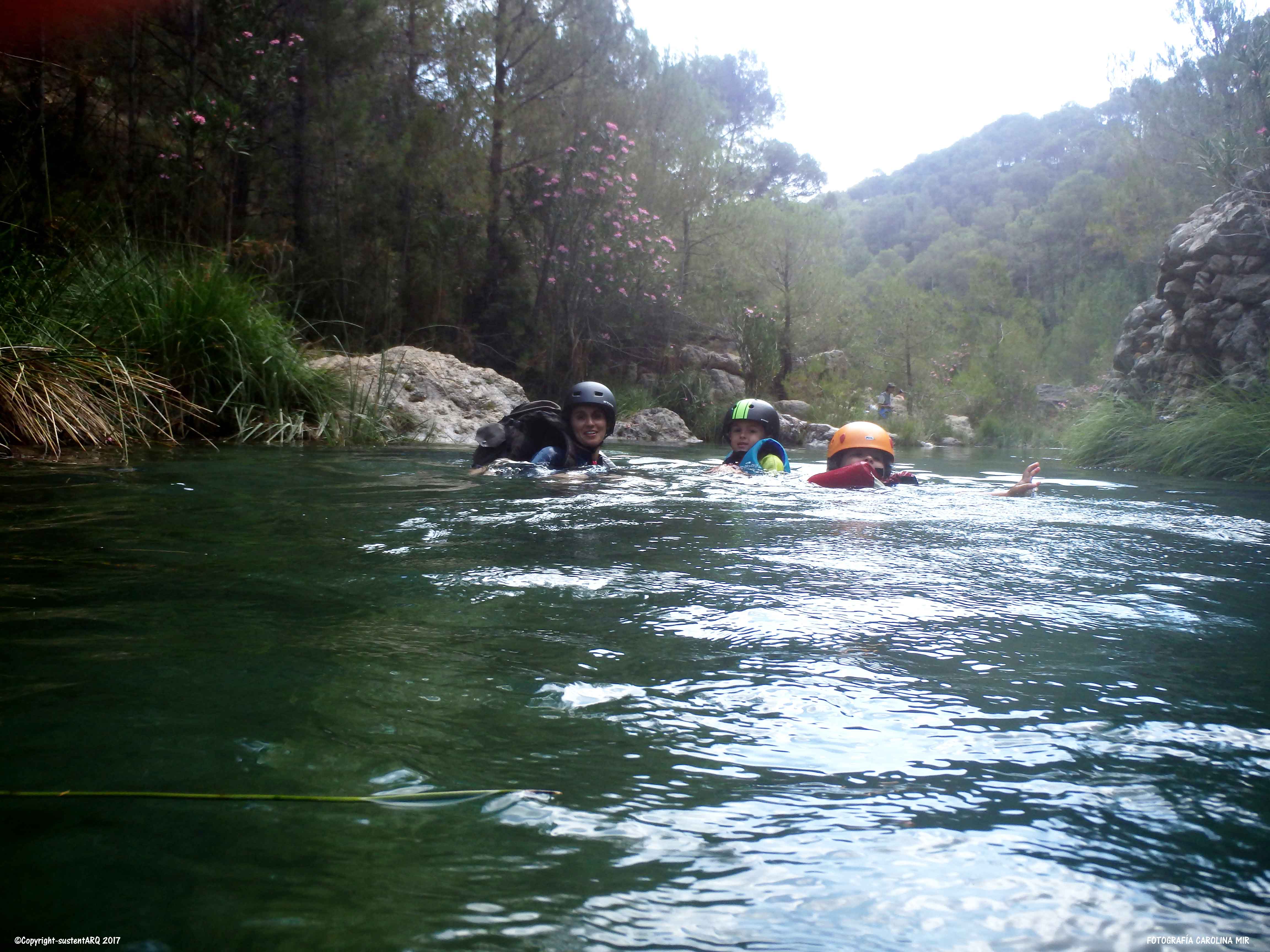 Llevamos también los cascos porque el agua tiene mucha fuerza en algunos puntos y sales disparado contra alguna roca. Así que así vamos protegidos. Y aún así hay que llevar cuidado con la corriente y los nanos porque en algunos puntos hay mucha agua y baja con mucha fuerza.