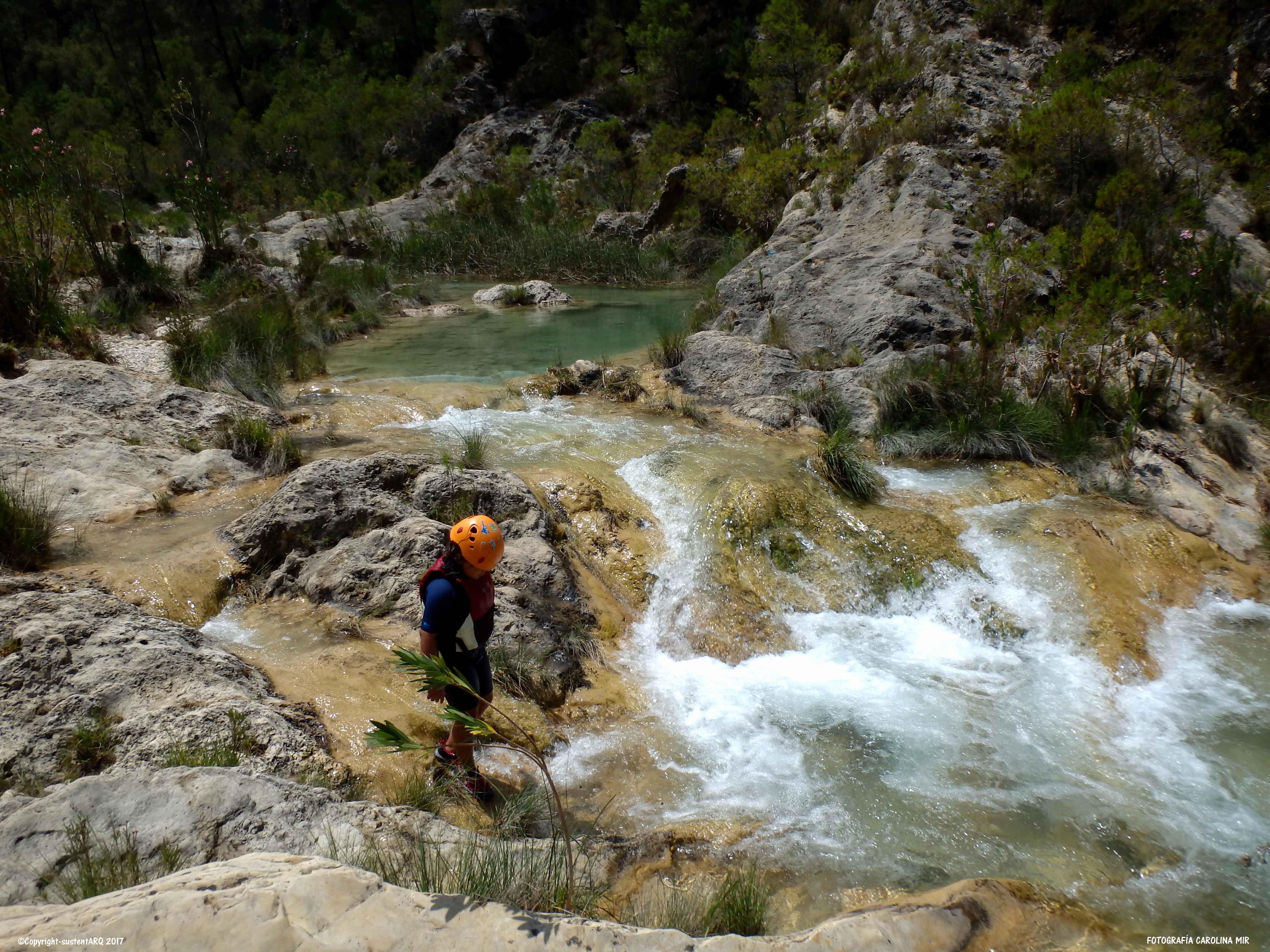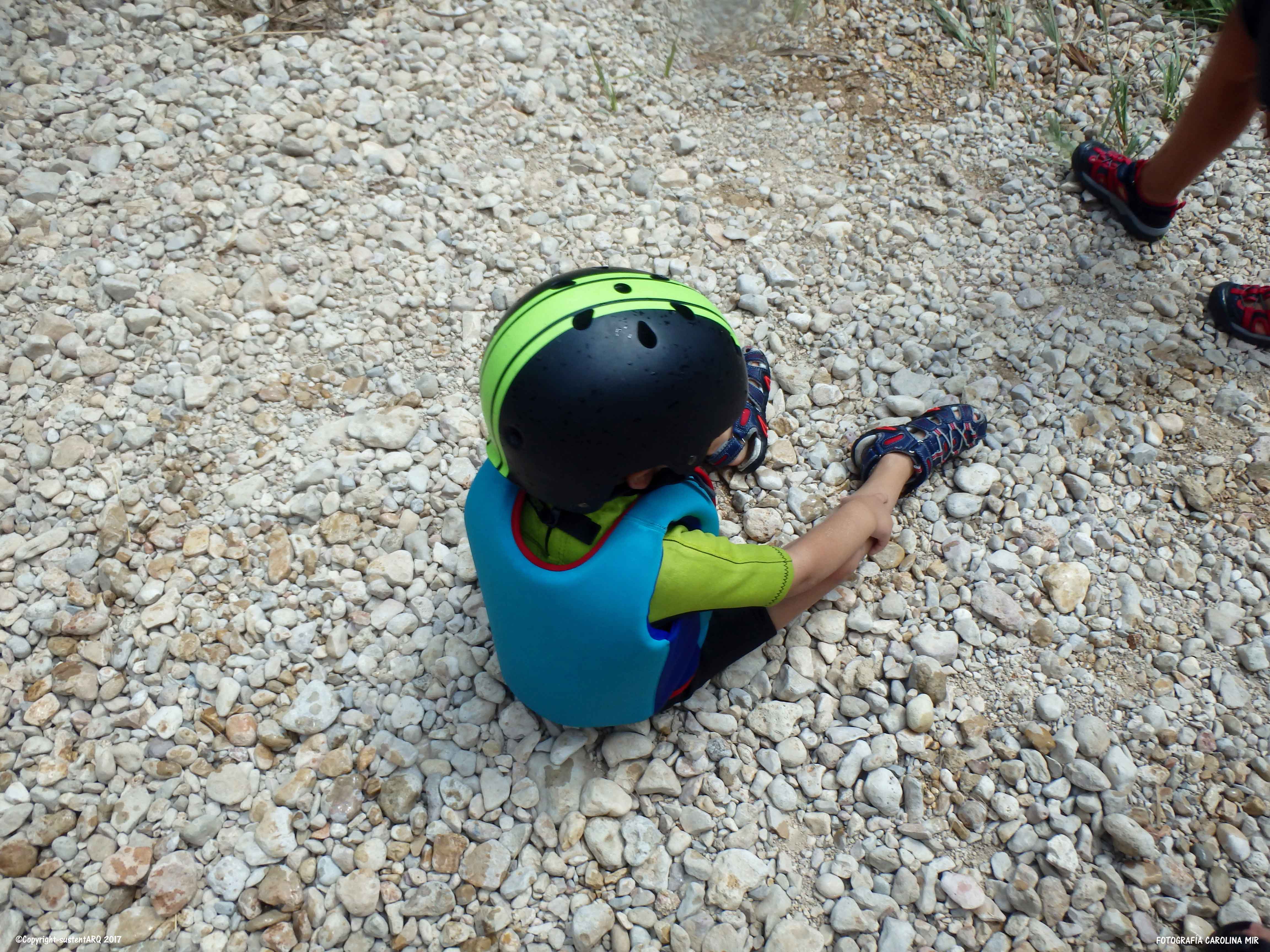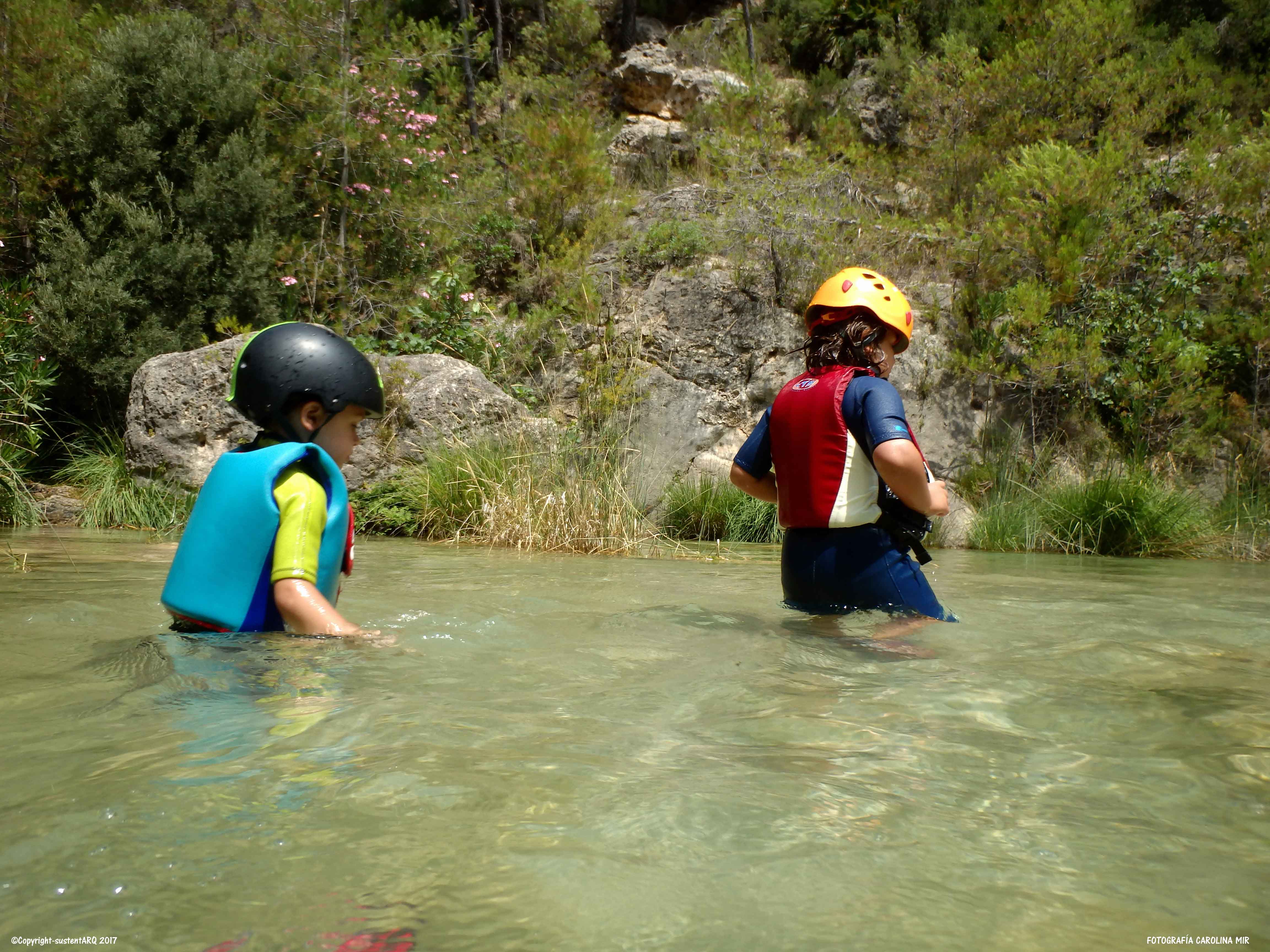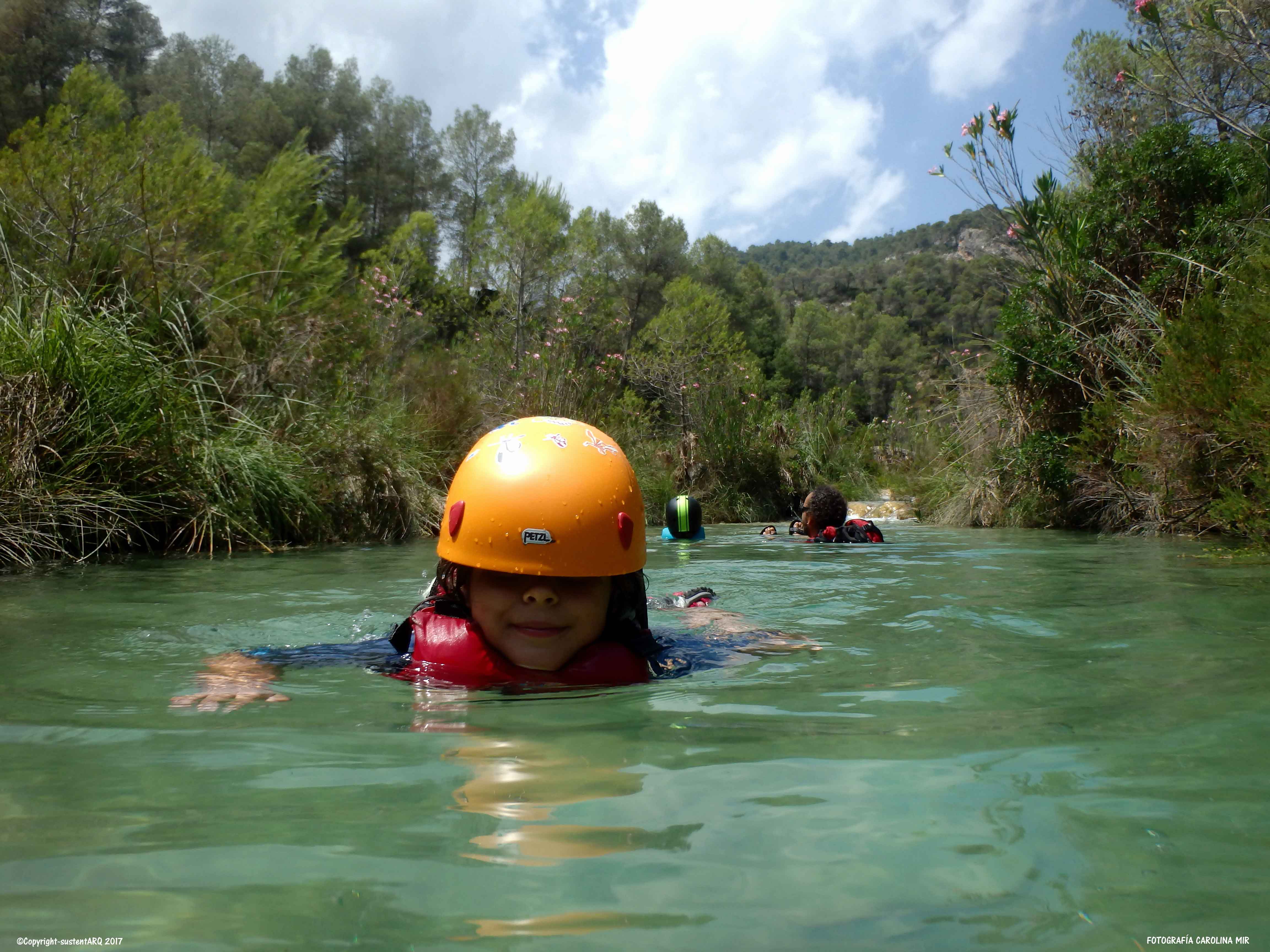 Llevamos también los cascos porque el agua tiene mucha fuerza en algunos puntos y sales disparado contra alguna roca. Así que así vamos protegidos. Y aún así hay que llevar cuidado con la corriente y los nanos porque en algunos puntos hay mucha agua y baja con mucha fuerza.