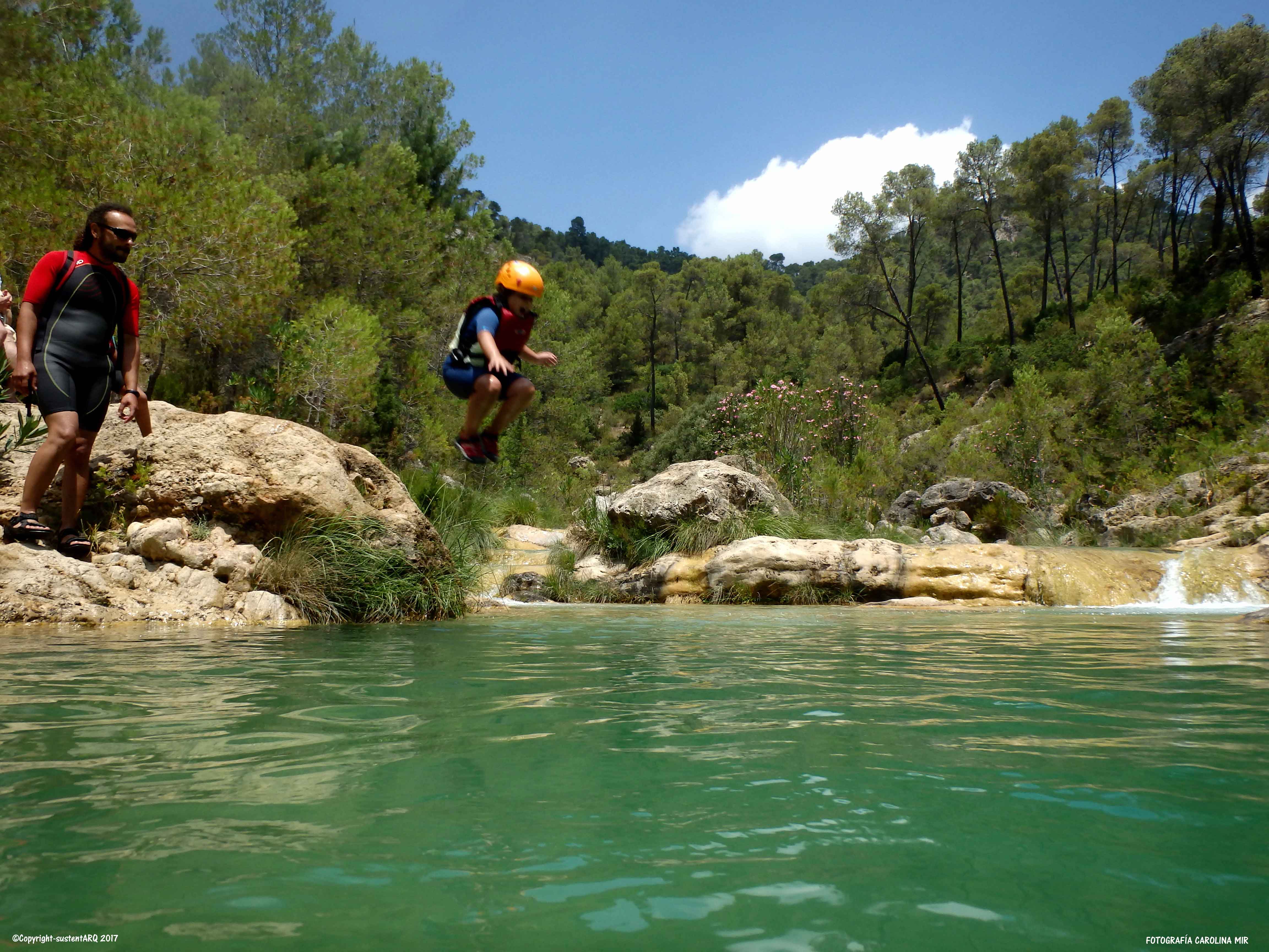 Nos acercamos hasta allí y hay una poza muy chula a la que saltar y que marca el final de nuestra ruta. Hemos visto el paso de la primera cuerda, y realmente es difícil para hacerlo con un nano de 5 años. Así que nos quedamos allí bañándonos un rato y refrescándonos porque ahora la vuelta la hacemos ya por la pista.