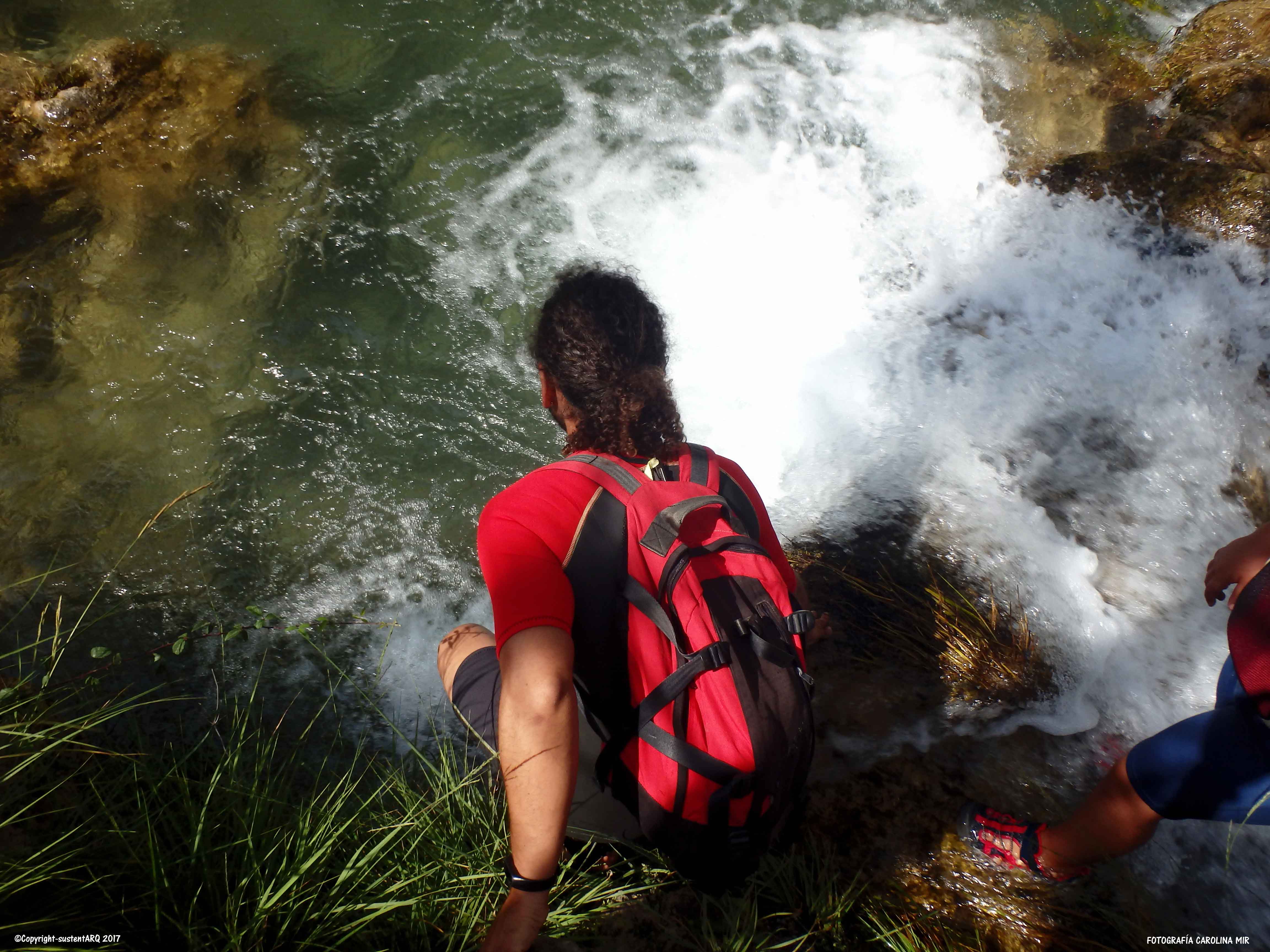 Nosotros hemos tenido que saltar ya a la primera poza para poder llegar hasta ese punto (El segundo badén a unos 700m del inicio). Y el agua está súper fresca. Hay bastante gente aquí al principio, y todos van en bañador y nos miran como si fuéramos marcianos, pero después de tirarnos al agua y sabiendo que tenemos 4km por el agua por delante, me parece que no nos van a molestar los neoprenos pese al calor que hace…