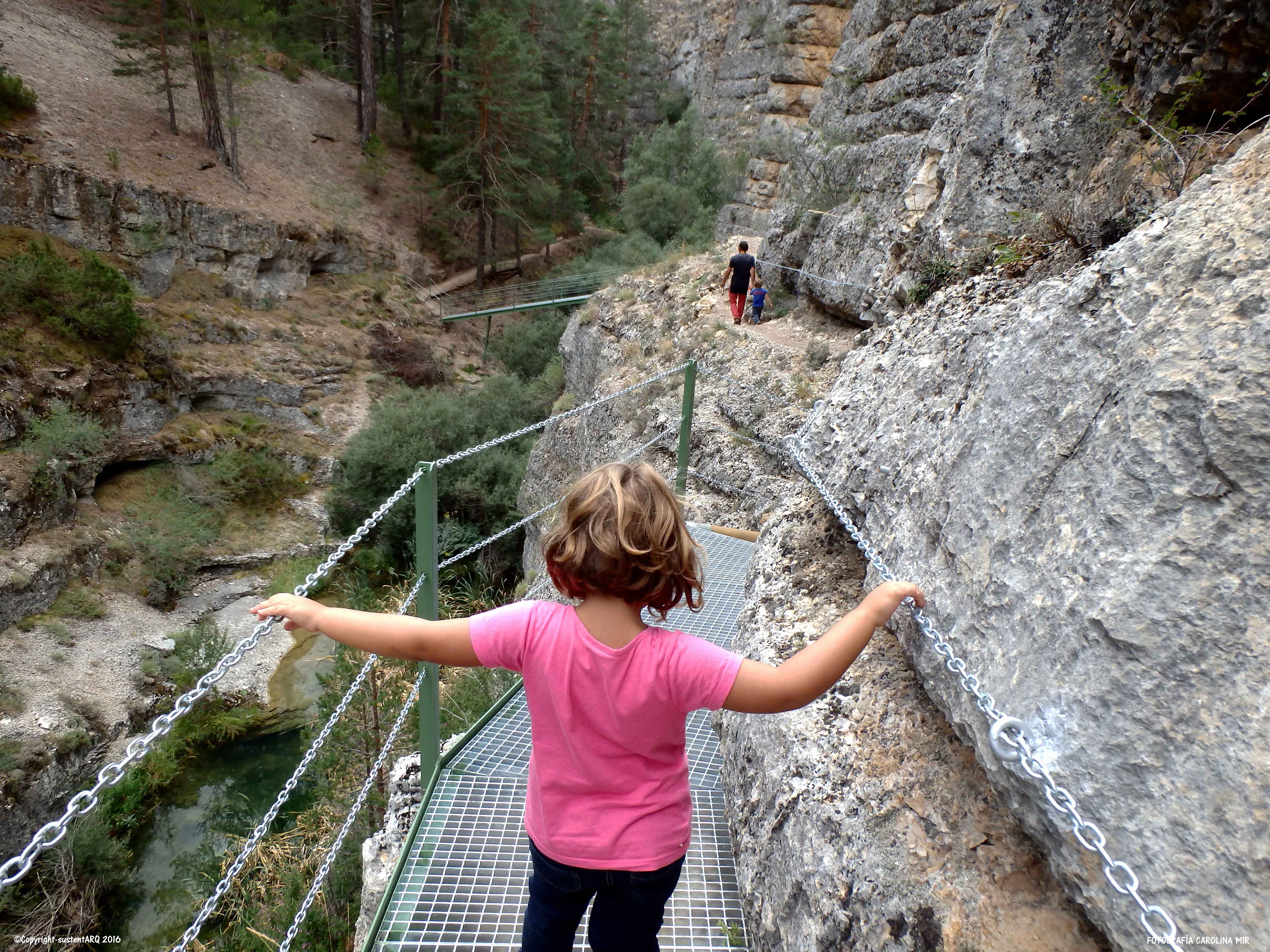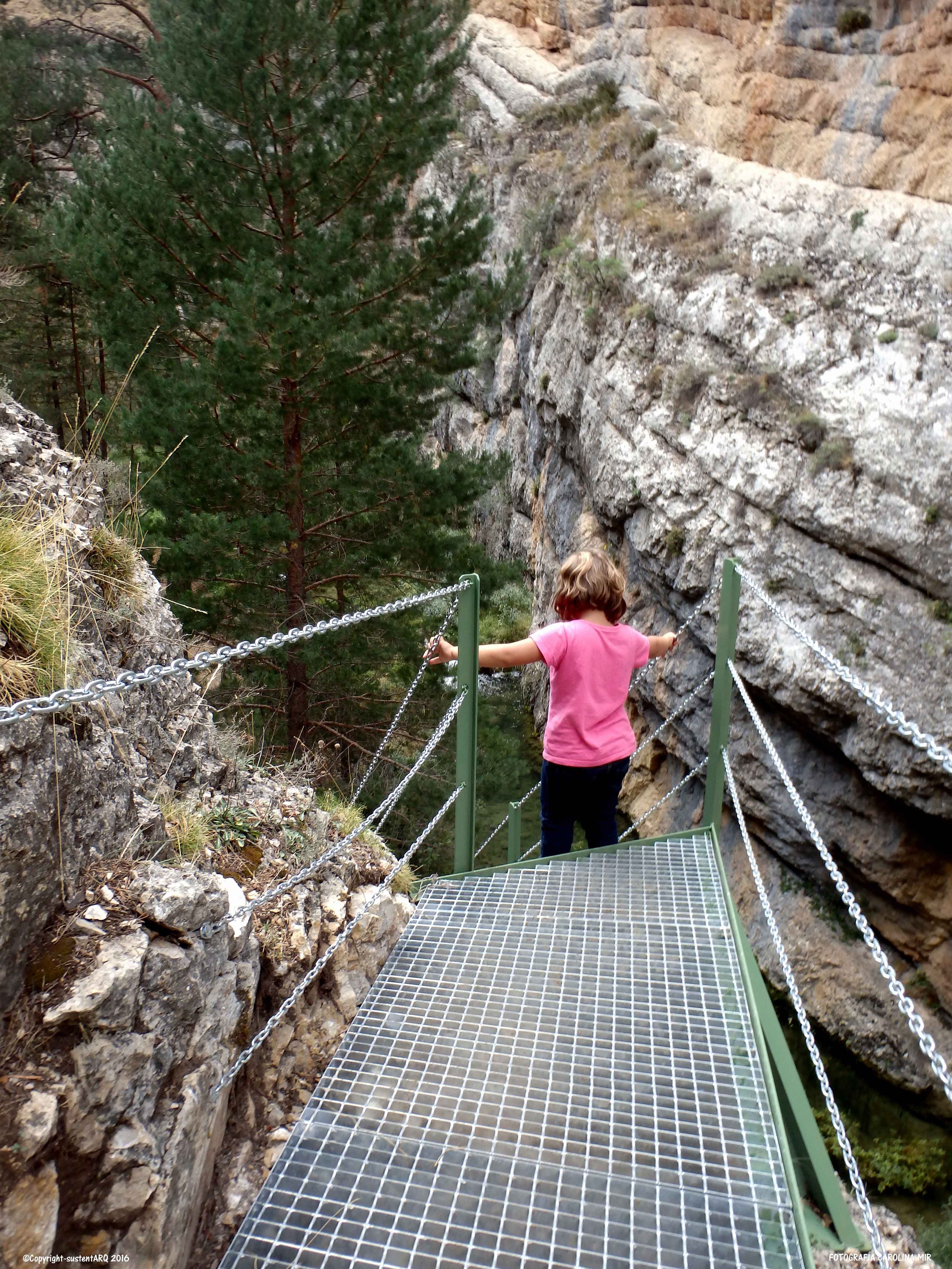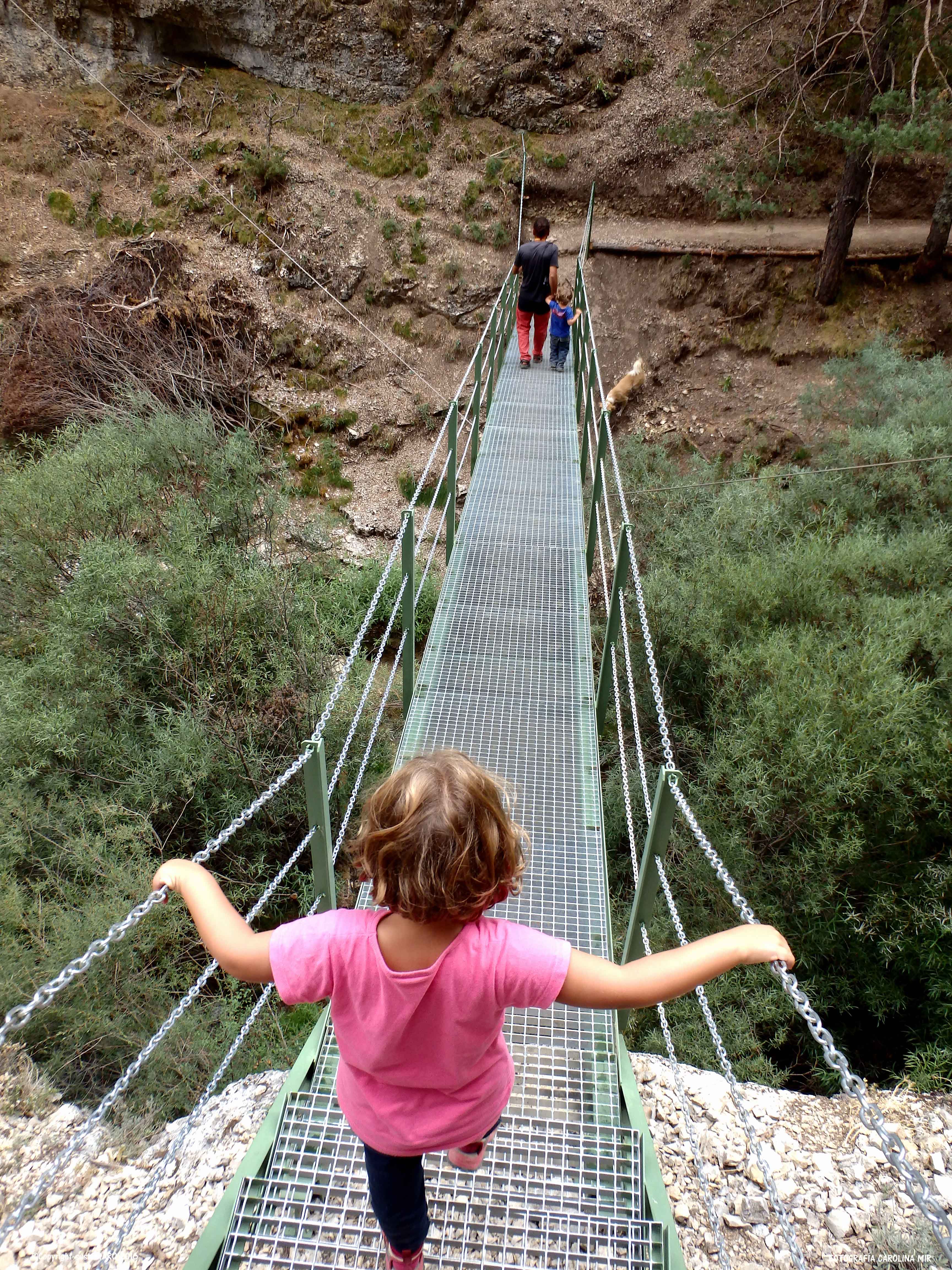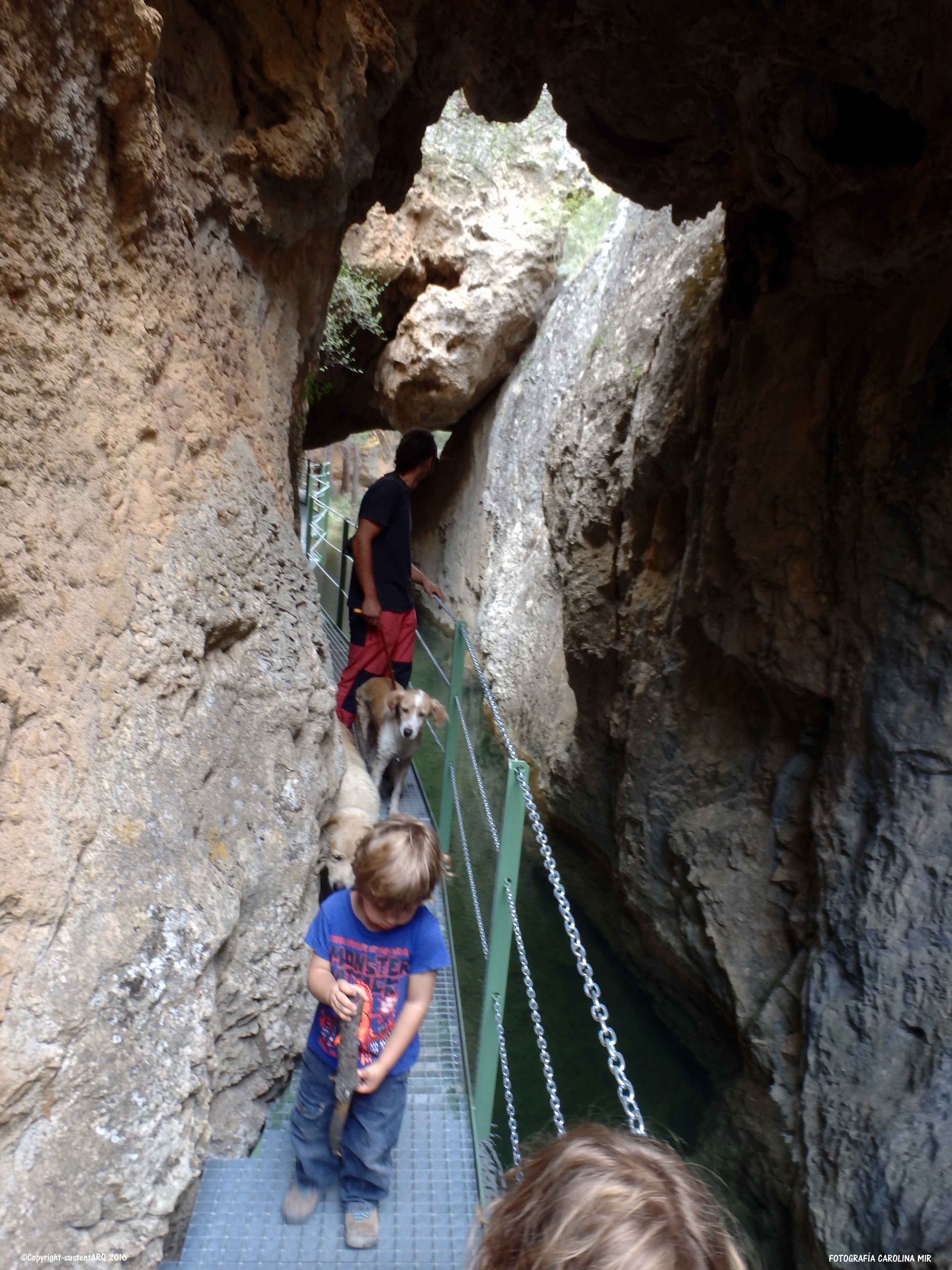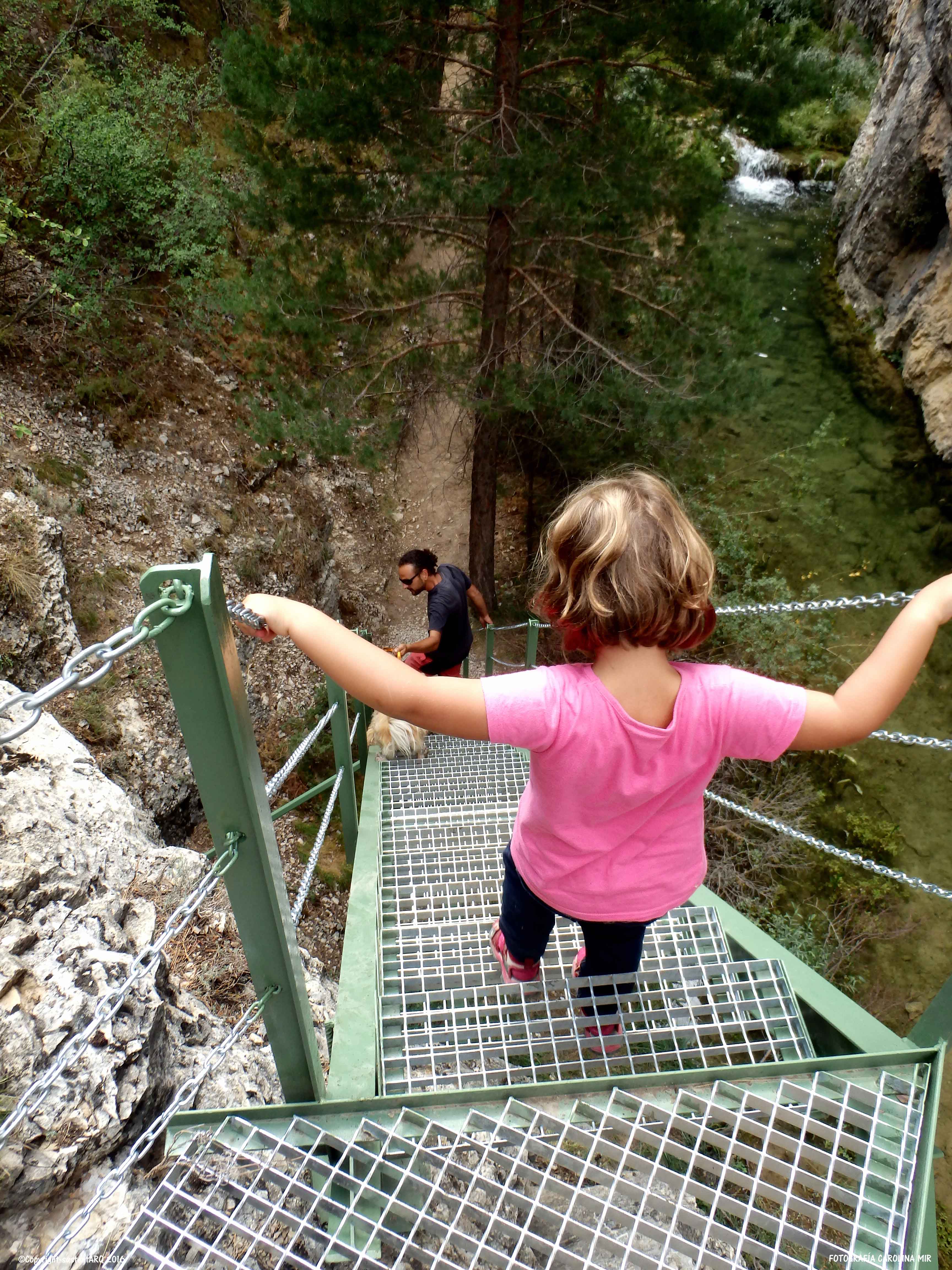 Pasado este punto, el recorrido discurre en algunos tramos por al lado o por encima del agua, y para ello, han acondicionado el terreno con cadenas, barandillas, escaleras y puentes metálicos, que no conllevan ningún peligro, aunque no hay que perder de vista a los nanos. También han arreglado algunas subidas con escalones de madera.