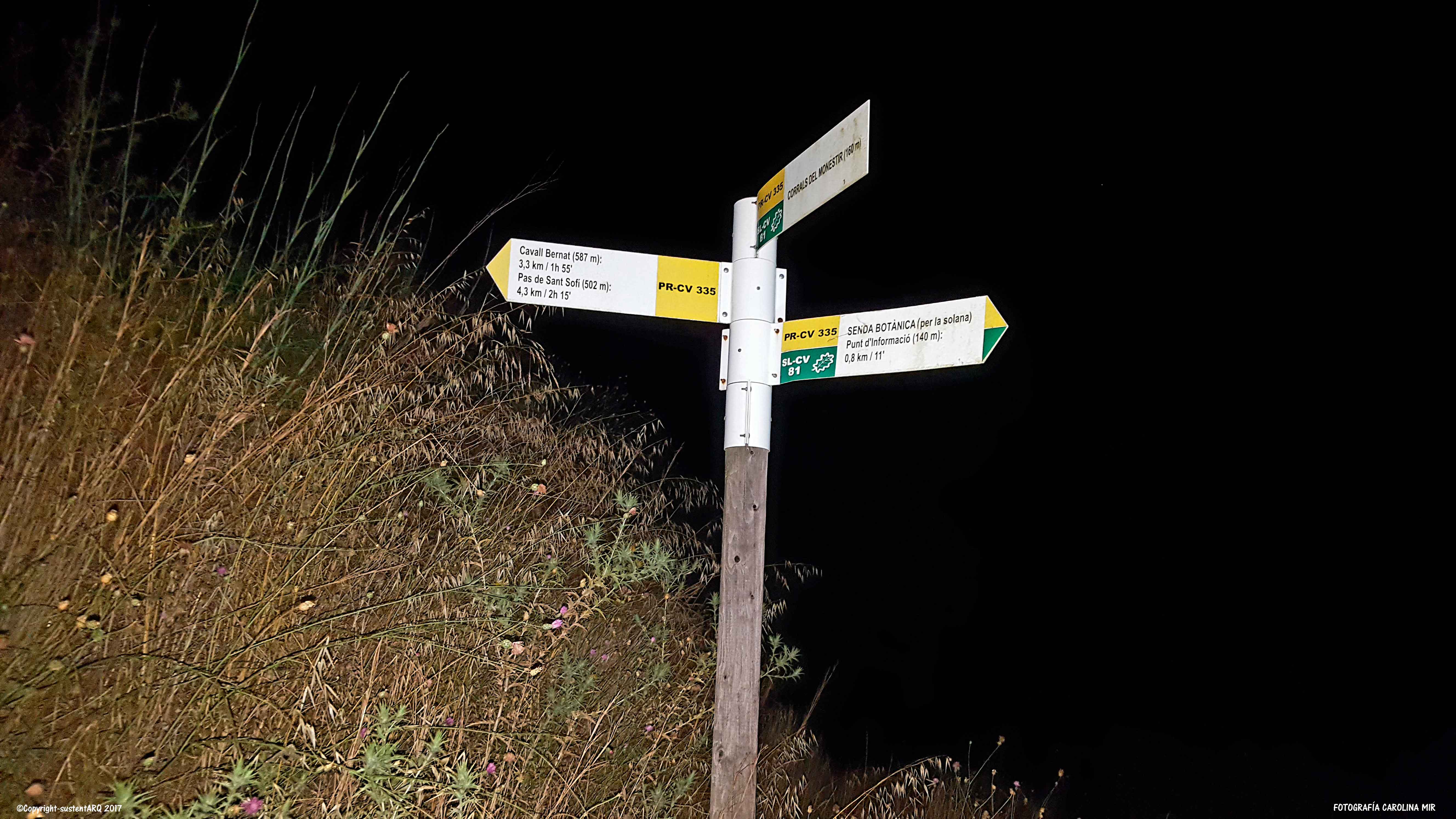 La SEÑAL CREU DEL CARDENAL-PAS DE SANT SOFÍ, nos indica el camino por el que hay que continuar. En este punto empieza ya el sendero angosto de tierra y roca entre matorrales. Lo recorremos unos 900m. A estas horas de la tarde, el paisaje está precioso. Se ven los verdes de muchas tonalidades, intensos. Las paredes verticales que antes parecían gigantes e inalcanzables, ya están aquí a nuestra vera, cada vez más cerca de ellas y cada vez más lejos del punto de partida, que se ve ya como una pequeña mancha blanca salpicada sobre el manto verde.