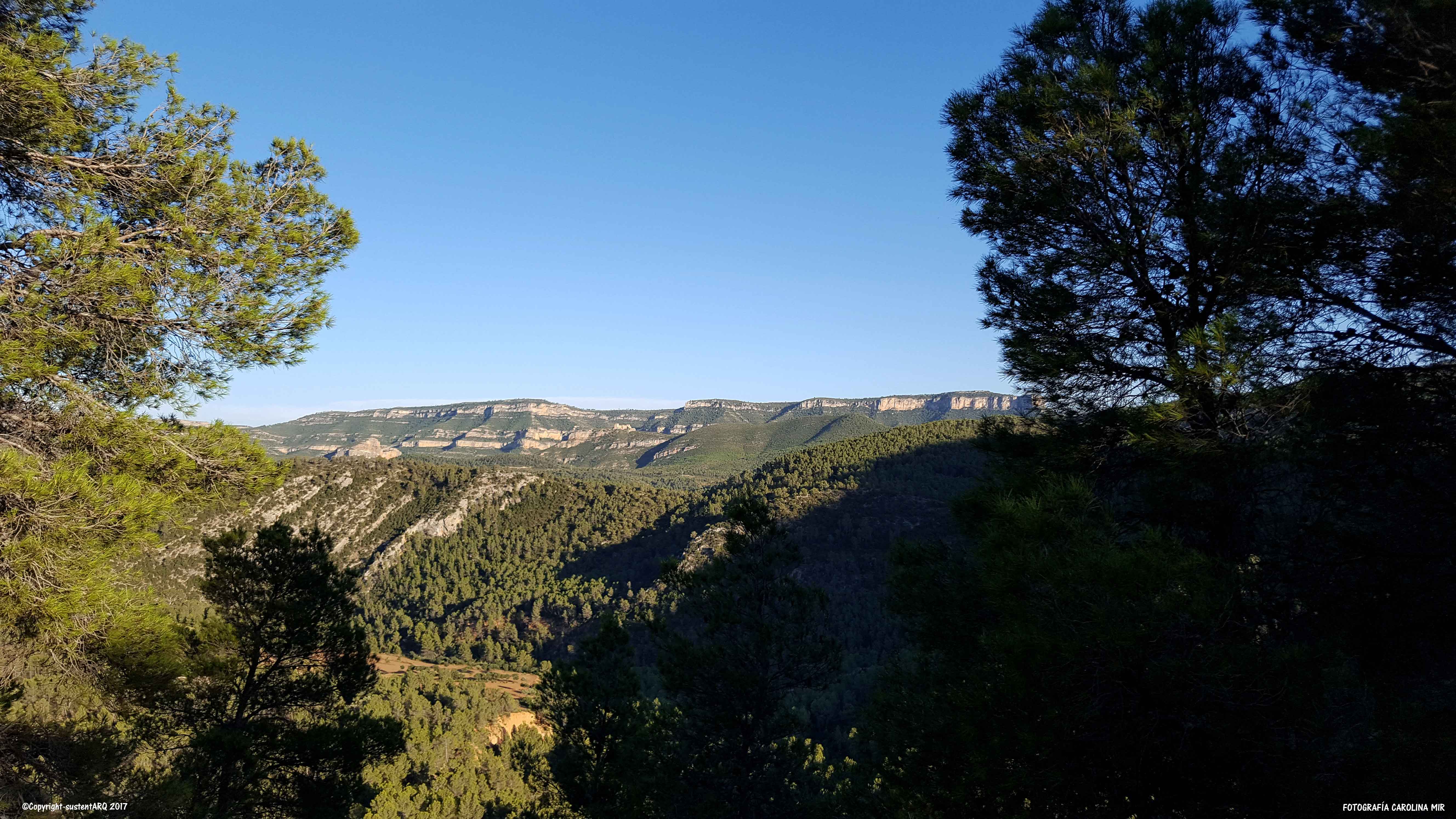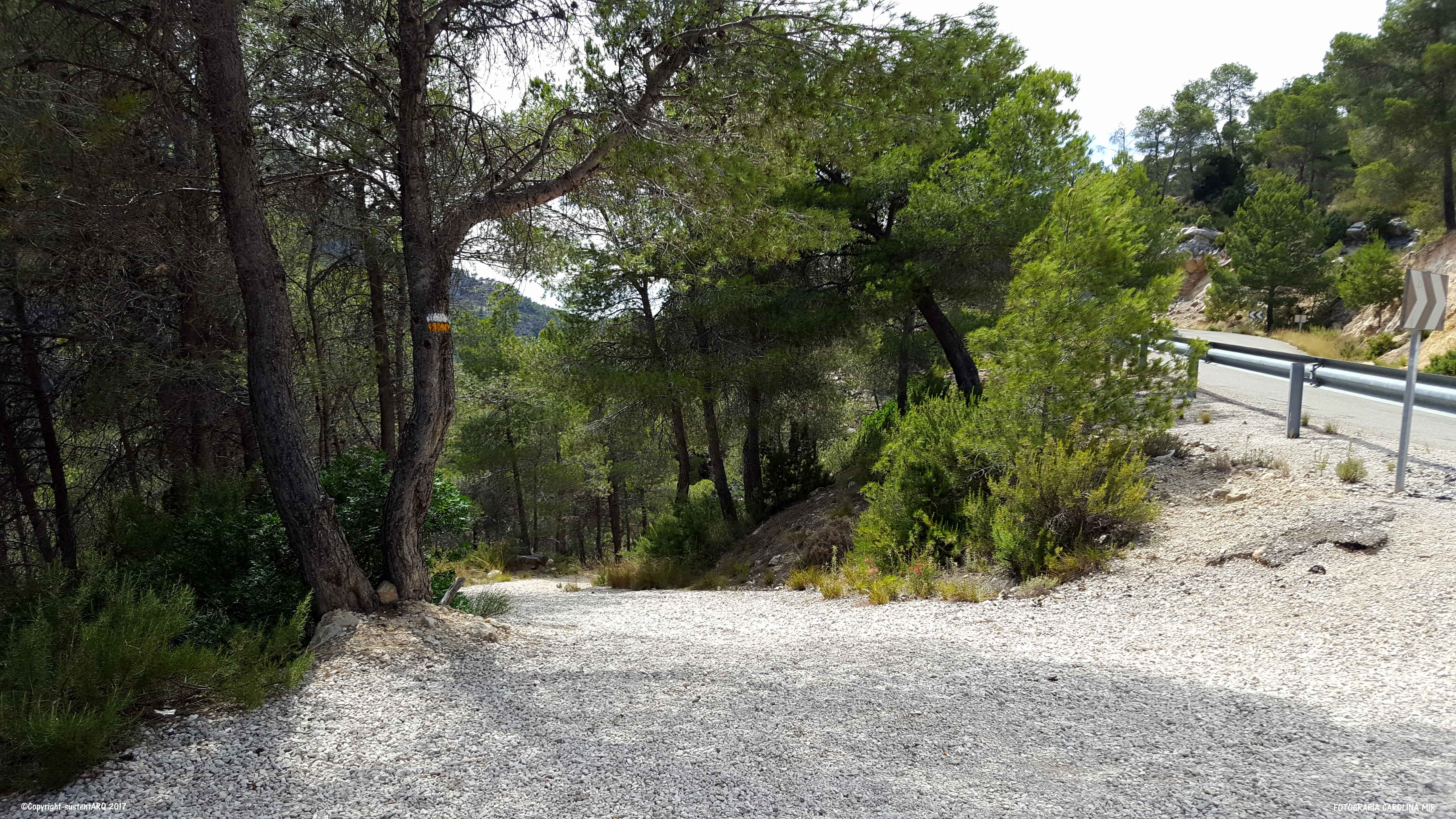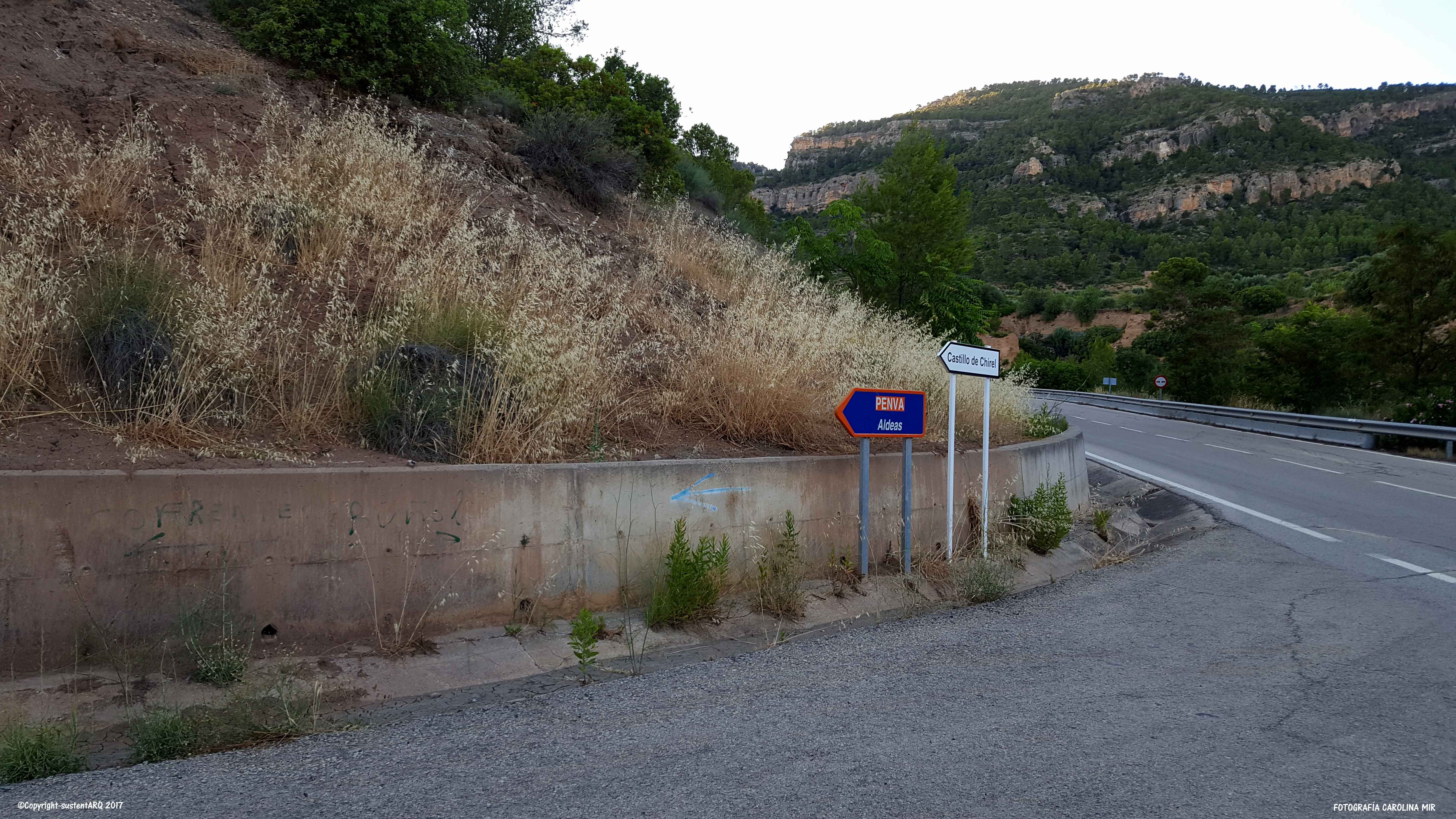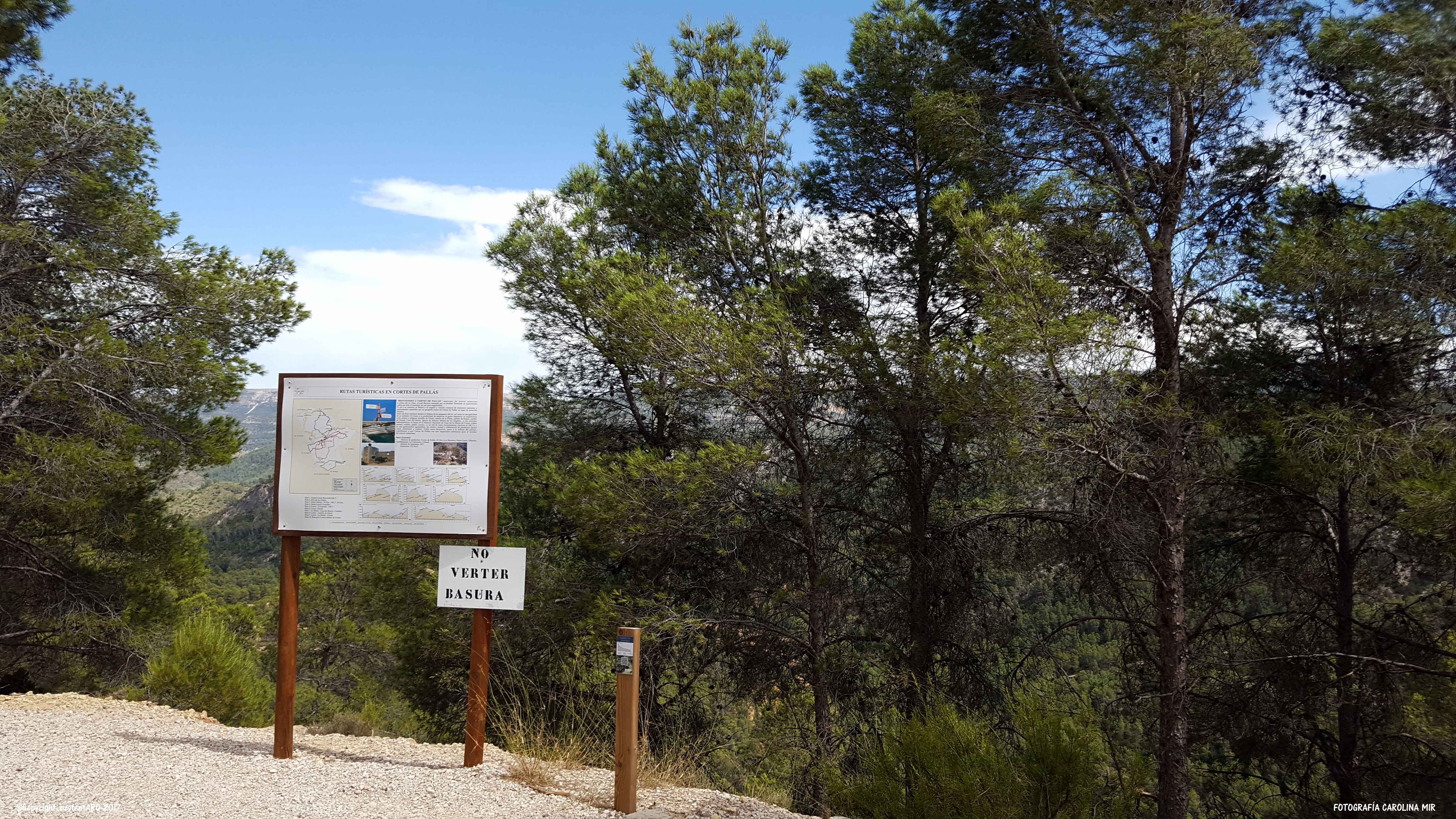 En la carretera que va hacia el CASTILLO CHIREL, a unos 5km del desvío inicial, y a unos 2km del desvío del Castillo, justo en una curva hacia la derecha hay una zona de tierra en frente, donde podemos dejar el coche para iniciar la RUTA. En este punto hay un CARTEL que pone RUTAS TURÍSTICAS EN CORTES DE PALLÁS. Y si te fijas bien, detrás del cartel, en el horizonte, puedes ver el CASTILLO CHIREL.