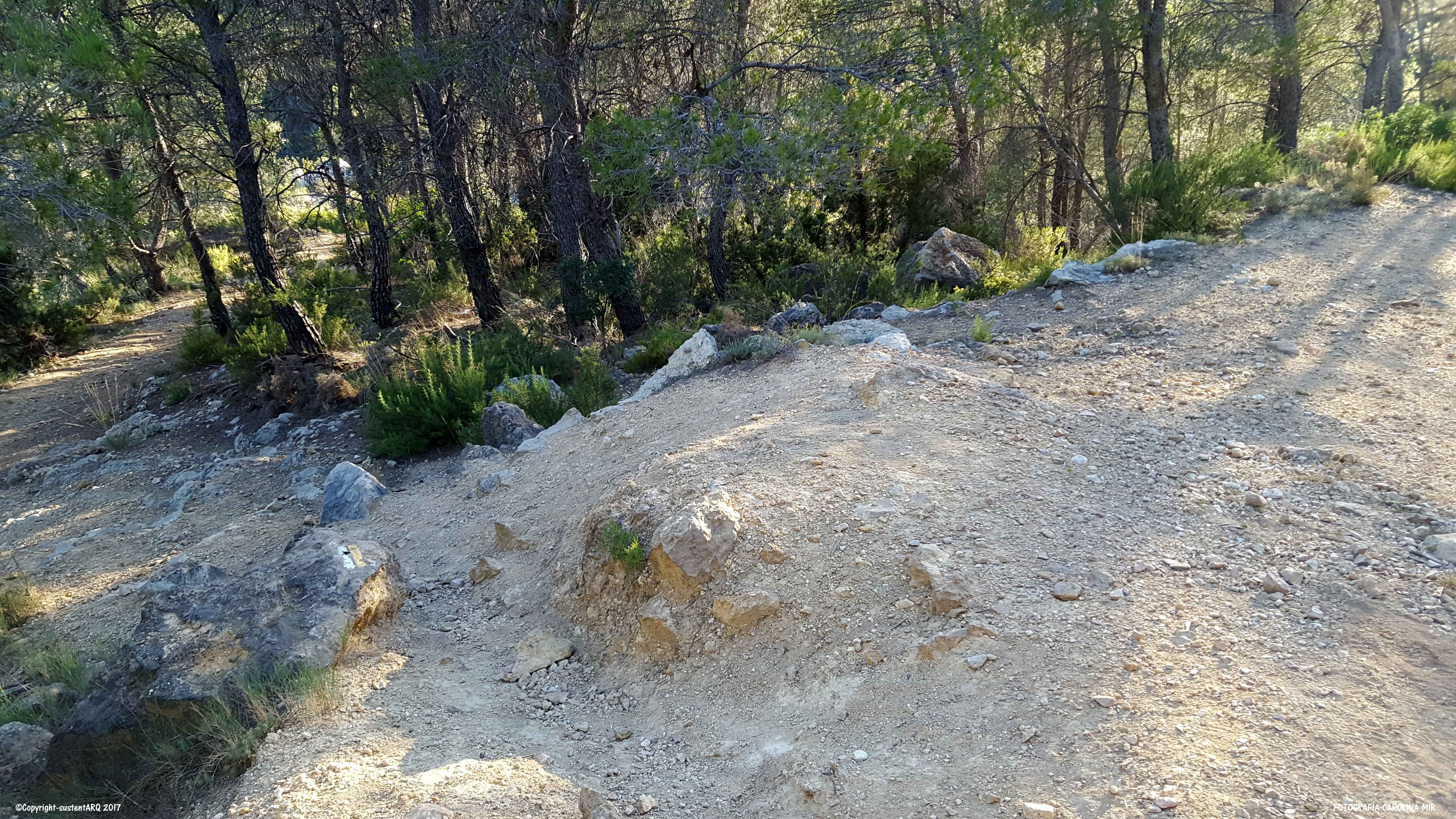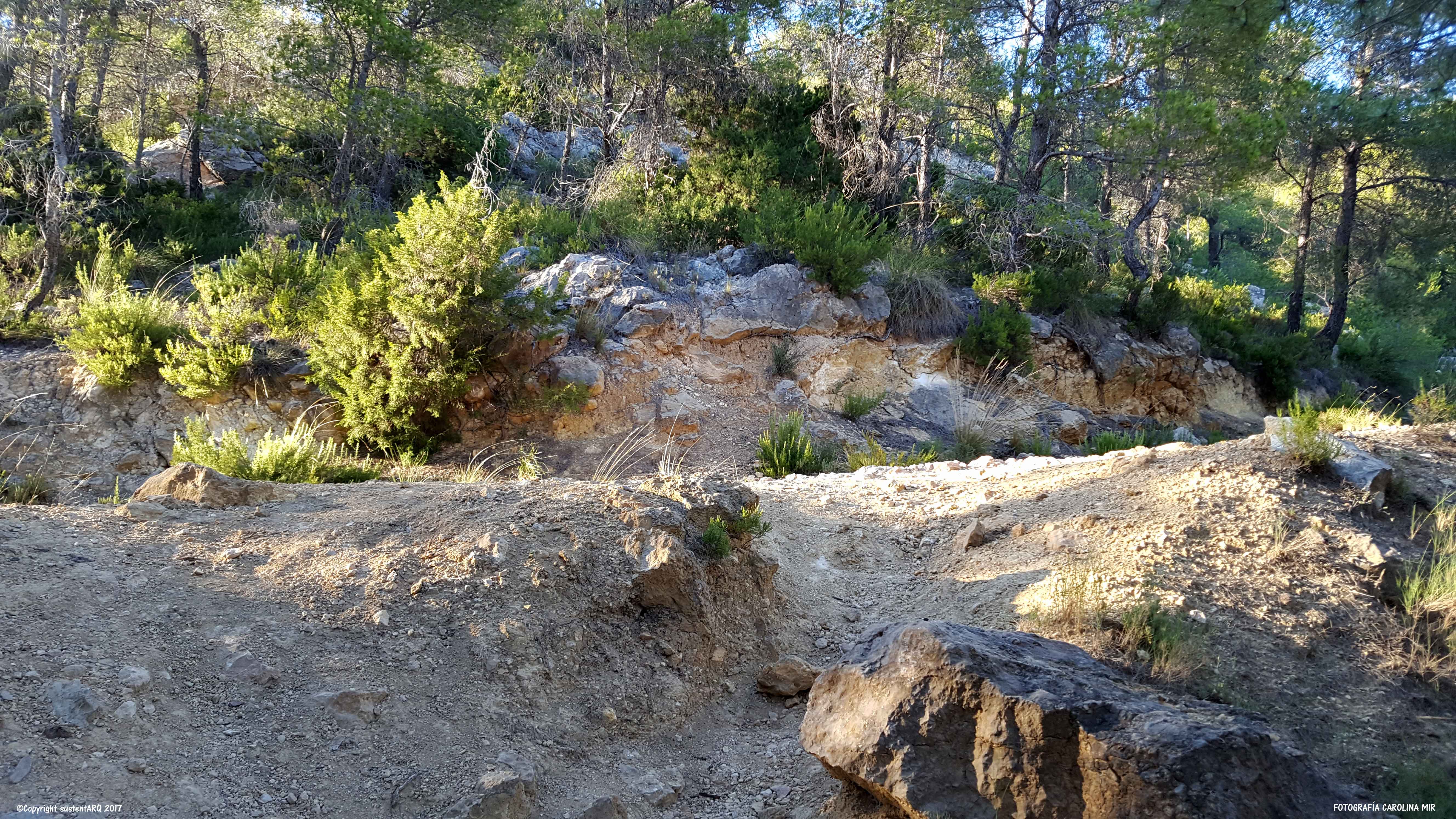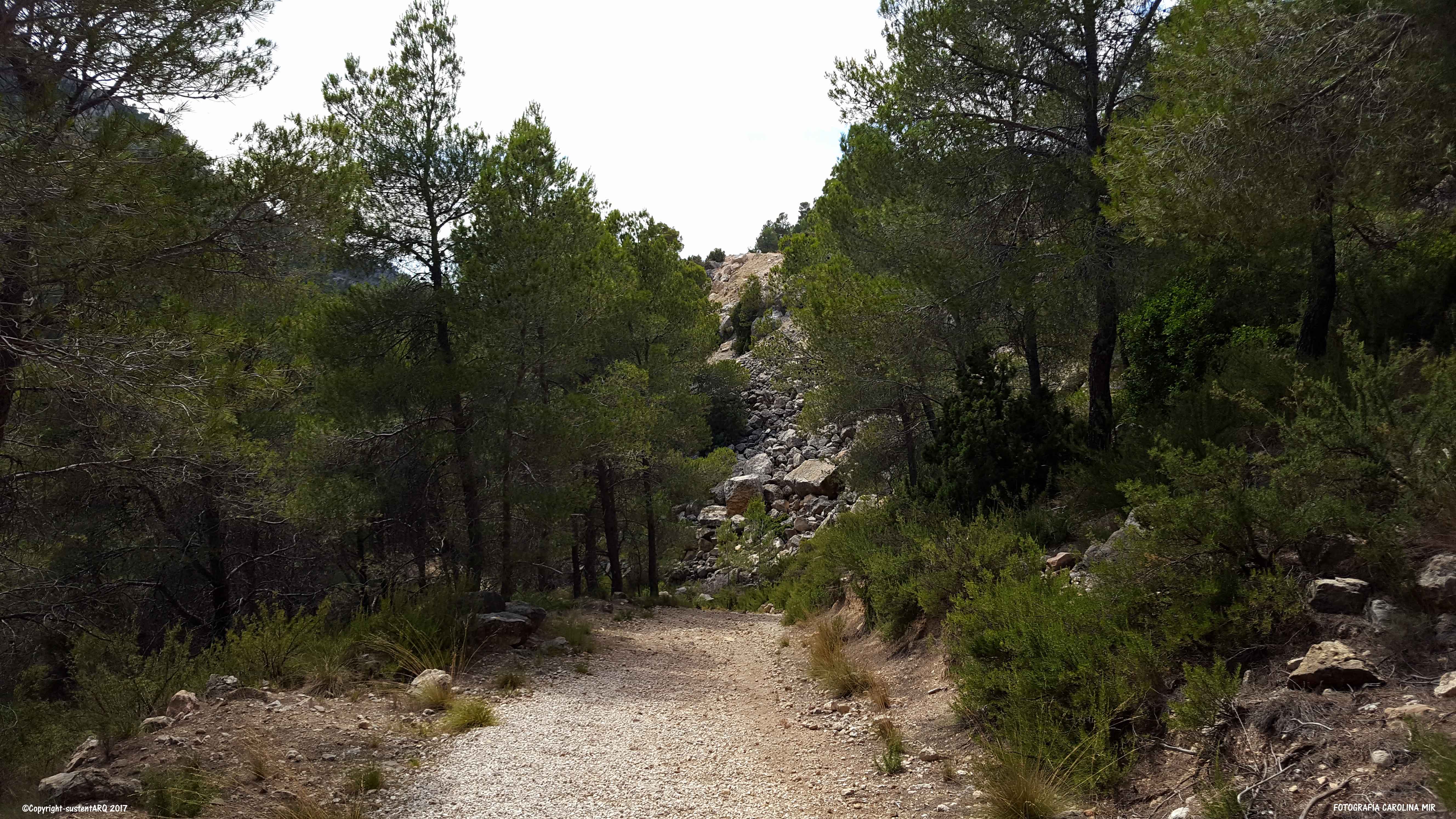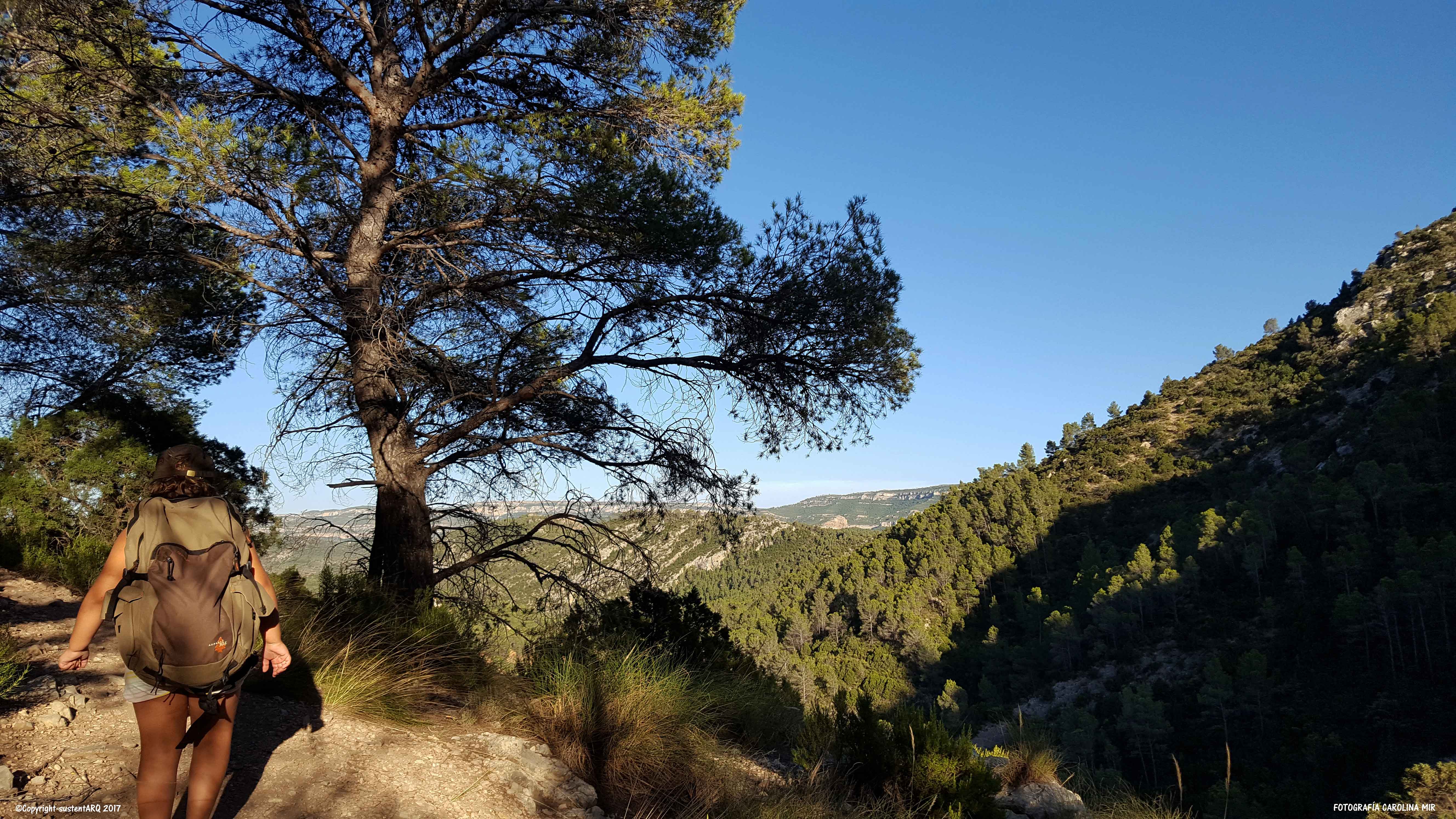 En la carretera que va hacia el CASTILLO CHIREL, a unos 5km del desvío inicial, y a unos 2km del desvío del Castillo, justo en una curva hacia la derecha hay una zona de tierra en frente, donde podemos dejar el coche para iniciar la RUTA. En este punto hay un CARTEL que pone RUTAS TURÍSTICAS EN CORTES DE PALLÁS. Y si te fijas bien, detrás del cartel, en el horizonte, puedes ver el CASTILLO CHIREL.