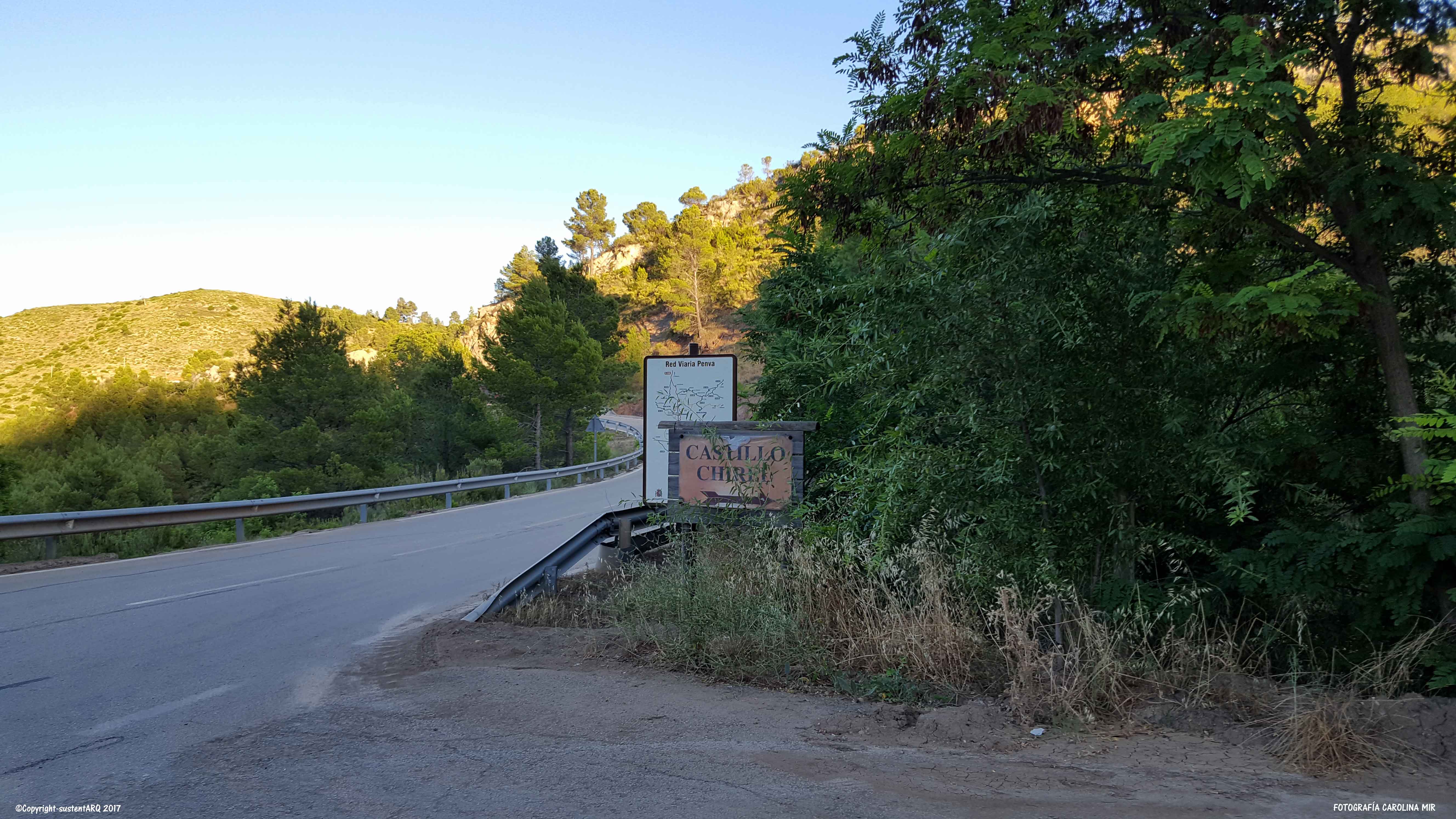 Cogemos la autovía A3 en dirección BUÑOL. Salimos por la VP-3031-BUÑOL y continuamos por la CV-425. En la rotonda dejamos VENTA DE GAETA a la derecha y seguimos por la CV-428 en dirección a CORTES DE PALLÁS, hasta un desvío hacia la derecha que pone: CASTILLO DE CHIREL Y PENVA ALDEAS. Continuamos por esta carretera unos 3km hasta el desvío hacia el CASTILLO, y seguimos unos 2km hasta la curva, donde en frente veremos una explanada de tierra donde poder dejar el coche.